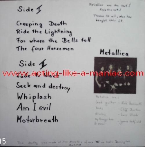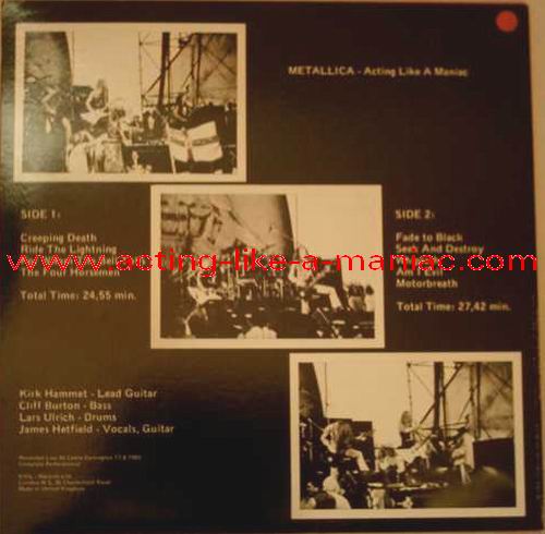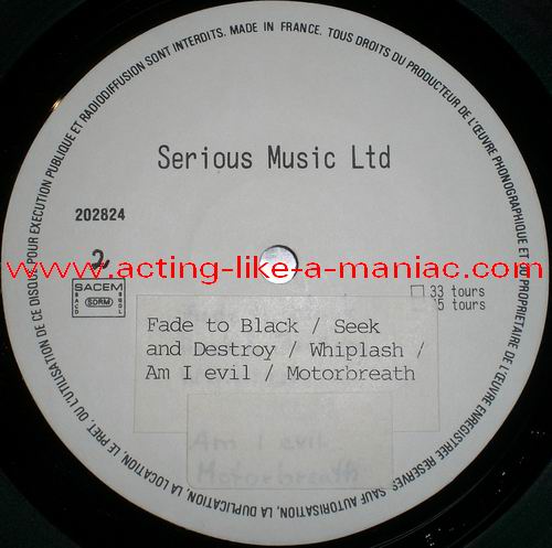 black vinyl with white "homemade" labels (reissue) black vinyl with white "homemade" labels (scan of "metallica" label version taken from "metallipromo.com")
