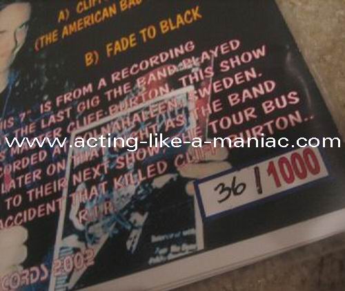 Type Of Vinyl: 7" Single Country / Year: USA/2002 Company: Boneless Records Source / Date: Stockholm, Solnahallen, Sweden, 26/09/86 Matrix: 107062 A & 107063 Track List: A. Bass Solo, Whiplash B. Fade To Black