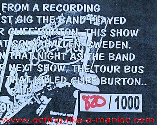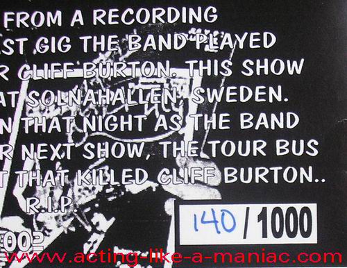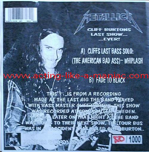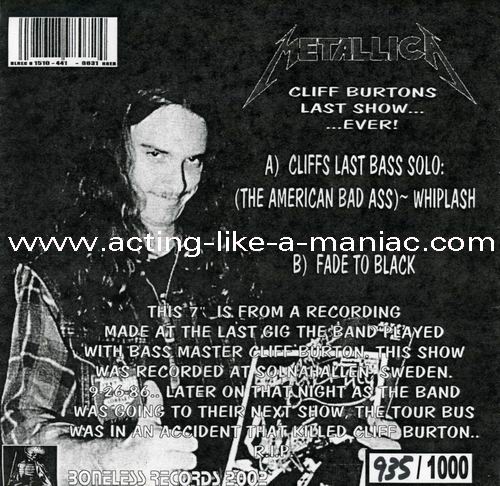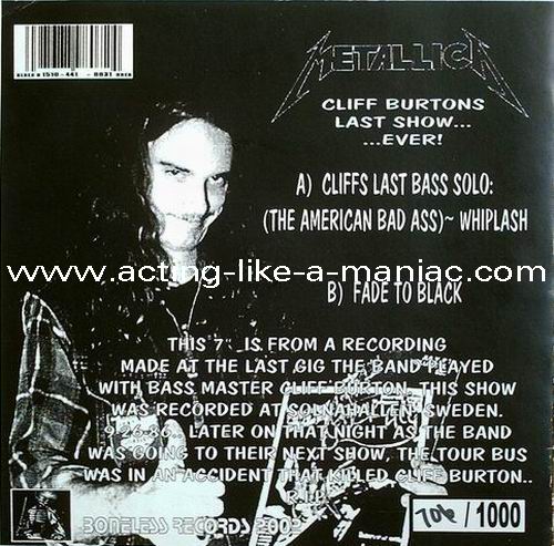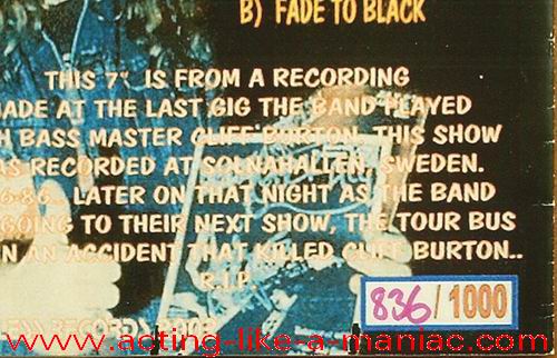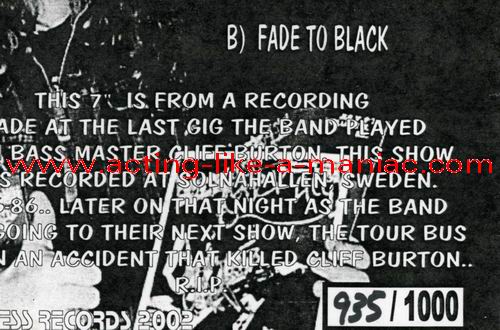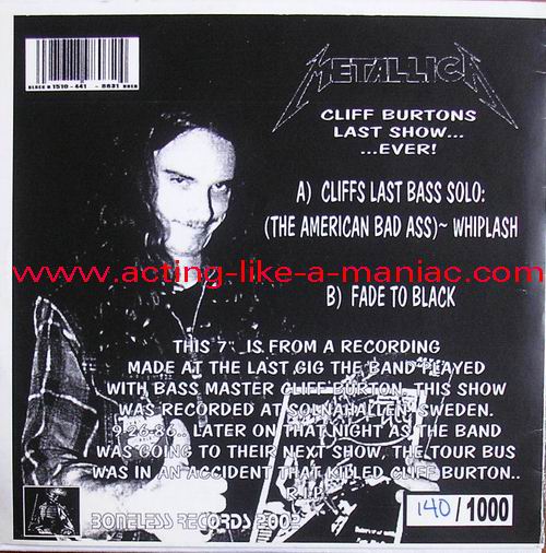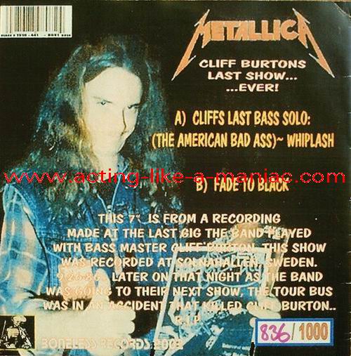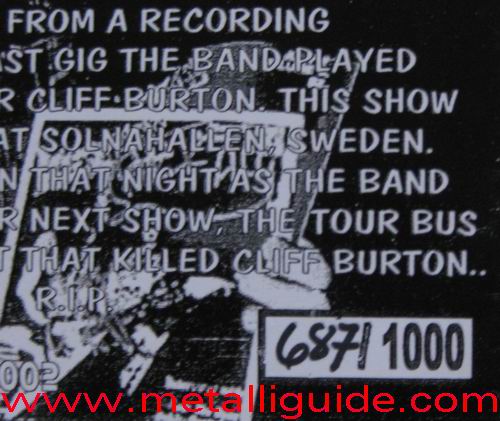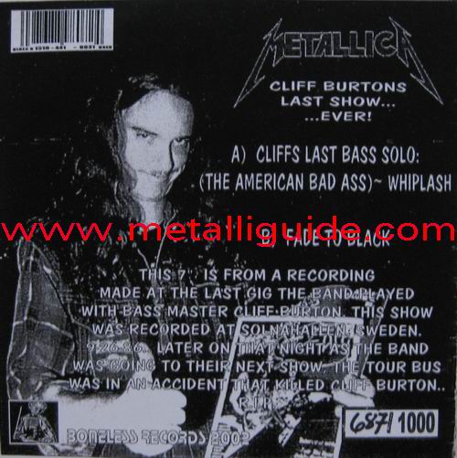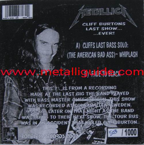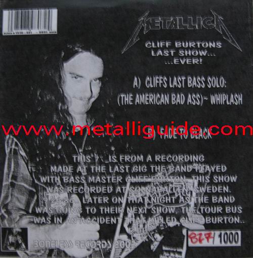 coloured cover #836/1000 (with wrong number on back) Type Of Vinyl: 7" Single Country / Year: USA/2002 Company: Boneless Records Source / Date: Stockholm, Solnahallen, Sweden, 26/09/86 Matrix: 107062 A & 107063 Track List: A. Bass Solo, Whiplash B. Fade To Black