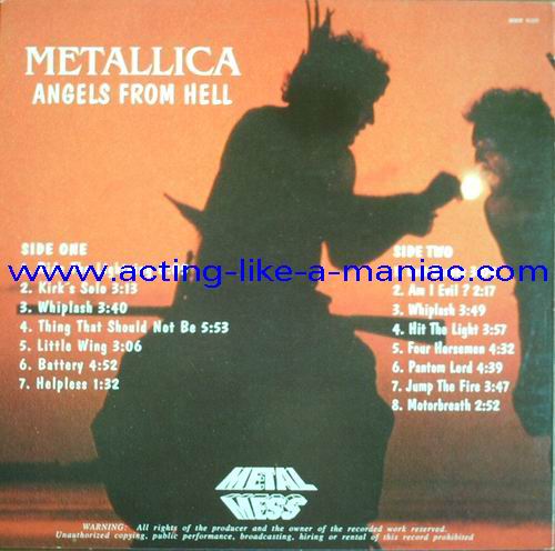 Type Of Vinyl: 1LP Country / Year: Germany / 1992 Company: Metal Mess Source / Date: *New York, Felt Forum, USA, 01/12/86 **Charlotte, Coliseum, USA, 02/26/89 ***Brooklyn, L'Amours, USA, 04/09/83 Matrix: MMR-9105-A & MMR-9105-B Track List: A. Ride The Lightning*, Bass Solo*, Whiplash*, The Thing That Should Not Be*, Guitar Solo**, Battery**, Helpless** B. Last Caress**, Am I Evil?**, Whiplash**, Hit The Lights***, The Mechanix***, Phantom Lord***, Jump In The Fire***, Motorbreath***