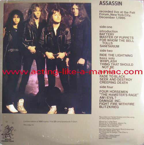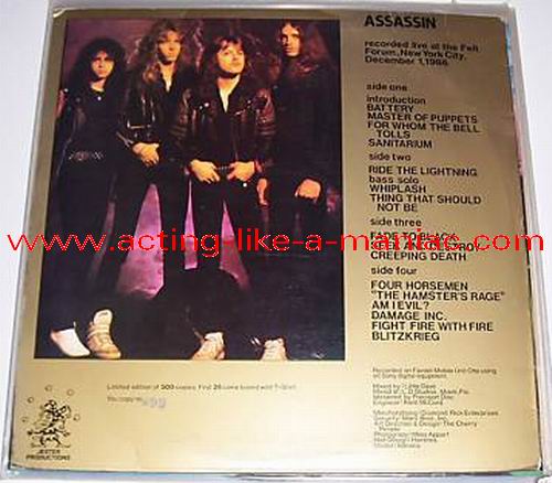 COLOUR DETAILS; translucent brown vinyl Type Of Vinyl: 2 LP Country / Year: USA / 1987 Company: Jester Productions Source / Date: New York, Felt Forum, USA, 01/12/86 Matrix (original with red "jester / neutral red / beauty" labels): "FLT 12/86 A" & "FLT 12/86 B" Matrix (reissue with "after hours" labels): "FLT 12/86 A" & "FLT 12/86 B" Matrix (reissue with "chain rec" labels): " Track List: A. Intro, Battery, Master Of Puppets, For Whom The Bell Tolls, Welcome Home B. Ride The Lightning, Bass Solo, Whiplash, The Thing That Should Not Be C. Fade To Black, Seek And Destroy, Creeping Death D. The Four Horsemen, Guitar Solo (Am I Evil?), Damage Inc., Fight Fire With Fire, Blitzkrieg