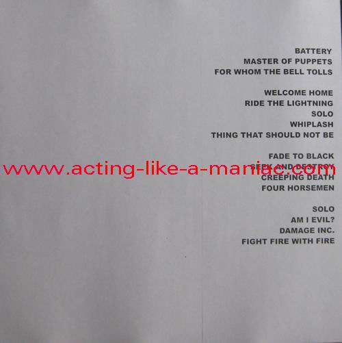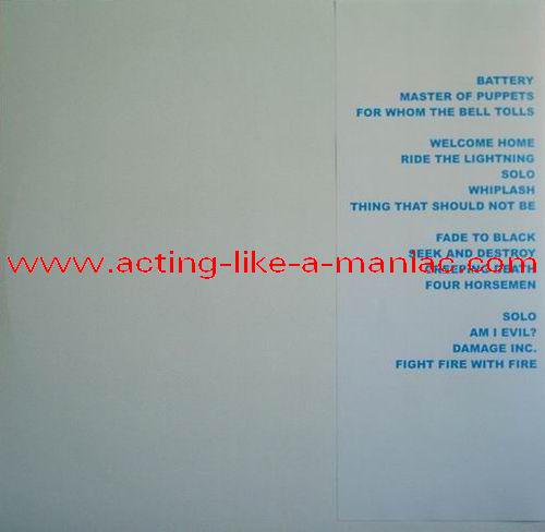 Type Of Vinyl: 2LP Country / Year: Holland/ 2001? Company: None Source / Date: Pougheepsie, Mid Houdson Civic Center, USA, 28/11/86 Matrix: MT 100 C-A- & MT 100 C-B- & MT 100 C-C- & MT 100 C-D- Track List: A. Intro, Battery, Master Of Puppets, For Whom The Bell Tolls, Welcome Home B. Ride The Lightning, Bass Solo, Whiplash, The Thing That Should Not Be C. Fade To Black, Seek & Destroy, Creeping Death D. The Four Horsemen, Guitar Solo, Am I Evil?, Damage Inc., Fight Fire With Fire, Blitzkrieg