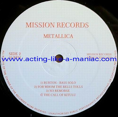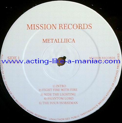white "mission records" label & neutral blue label Type Of Vinyl: LP Country / Year: Sweden/1990 Company: Solid Ground Records Source / Date: Stockholm, Göta Lejon, Sweden, 12/12/84 Matrix: MET-LP-001-A & MET-LP-001-B Track List: A. Intro, Fight Fire With Fire, Ride The Lightning, Phantom Lord, The Four Horsemen B. The Four Horsemen, Bass Solo, For Whom The Bell Tolls, No Remorse, The Call Of Ktulu