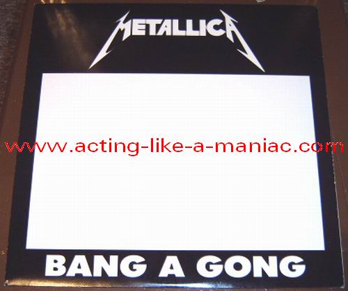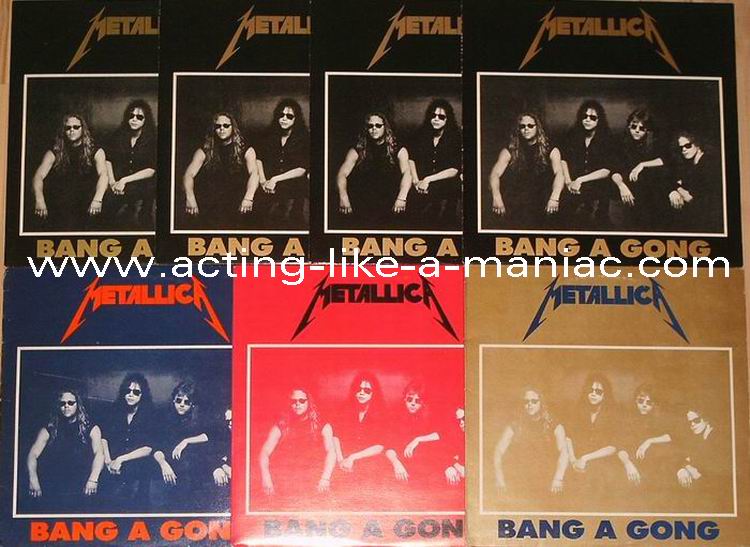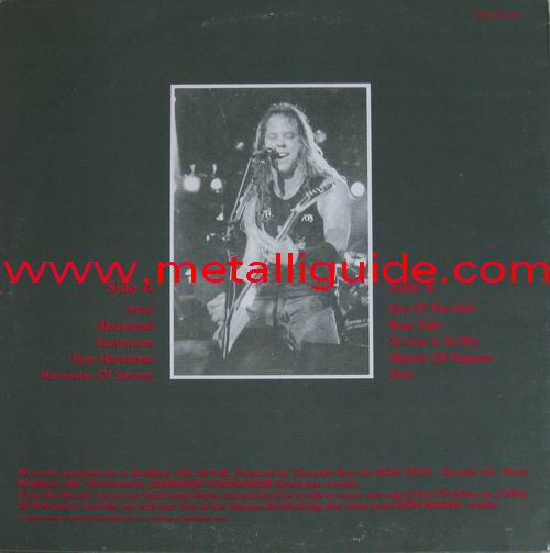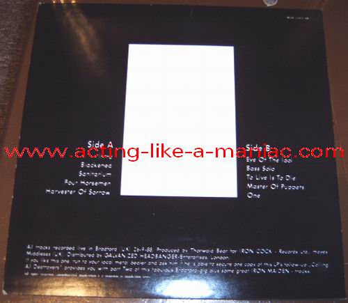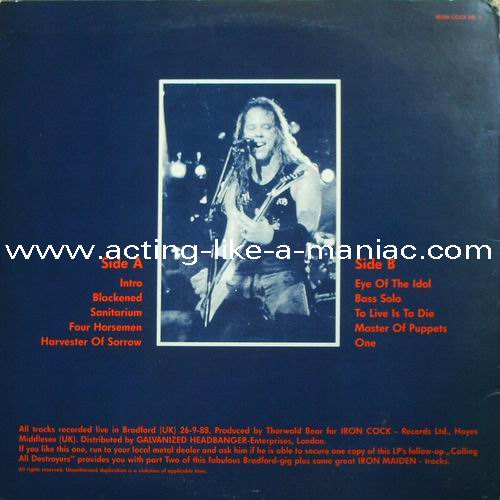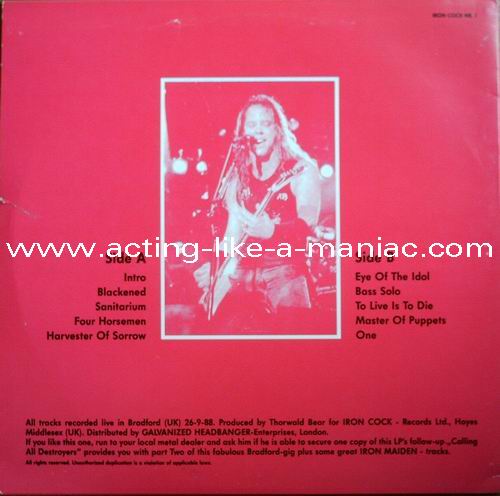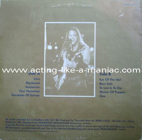 light orange vinyl Type Of Vinyl: 1LP Country / Year: Germany / late 1988 & early 1989 Company: Iron Cock Records Ltd. / Galvanized Headbanger-Enterprises Source / Date: Bradford, St. Georges Hall, England, 26/09/88 Matrix: 647015 A SNB & 647015 B SNB Track List: A. Blackened, Welcome Home, The Four Horsemen, Harvester Of Sorrow B. Eye Of The Beholder, Bass Solo, Master Of Puppets, One There are seven different covers (plus "test" cover): "Black/White" (Test Press Cover), "Black/Gold" (original), "Black/Yellow", "Blue/Red", "Gold/Blue", "Green/Pink", "Pink/Black" & "Wine Red/Gold"