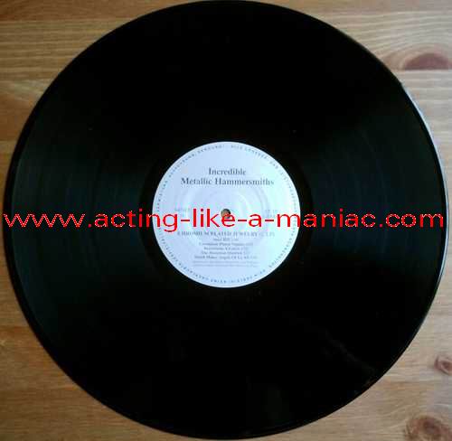 Notes: The first issue came out on black vinyl with the "incredible metallic hammersmiths" labels and the "black/gold" cover. A few weeks later the clear version came out, followed by red & yellow, and after that the blue & green version came out. All versions were repressed (except the black & clear ones). There is also a "black/white" test press cover.