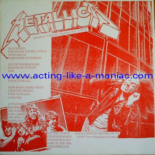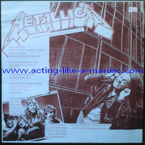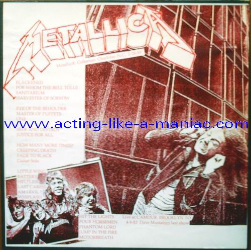 Colour Details; so far, all records (original & reissue) are translucent brown Type Of Vinyl: 3 LP + 3 LP BOX SET Country / Year: USA / 1989 Company: None Source / Date: *Charlotte, Coliseum, USA 26/02/89 **Brooklyn, L'Amours, USA, 09/04/83 Matrix: a-side: MET-1 L·34098 b-side: MET·2 L·34098·X c-side: MET·3 L-33821 d-side: MET-4 L·33821 e-side: MET-5 L-33821 f-side: MET·6 L-33821 Track List: A. Blackened*, For Whom The Bell Tolls*, Welcome Home*, Harvester Of Sorrow* B. Eye Of The Beholder*, Bass Solo*, Master Of Puppets*, One* C. Seek And Destroy*, And Justice For All* D. Creeping Death*, Fade To Black*, Guitar Solo* E. Battery*, Helpless*, Last Caress*, Am I Evil ?*, Whiplash* F. Hit The Lights**, The Mechanics**, Phantom Lord**, Jump In The Fire**, Motorbreath**