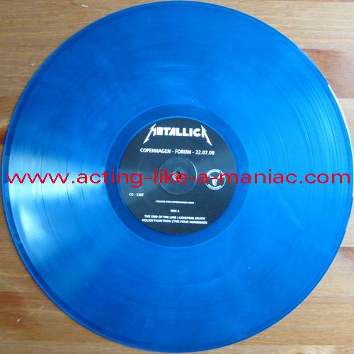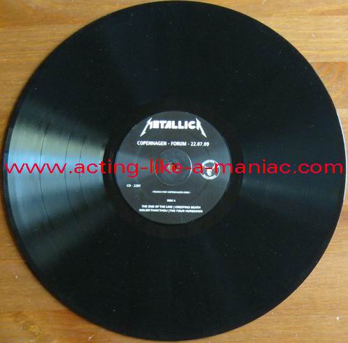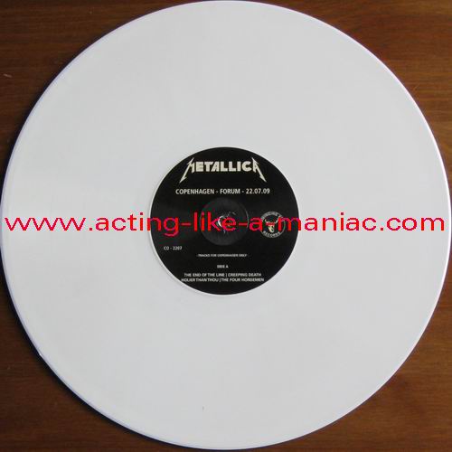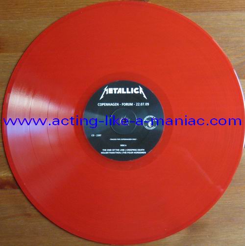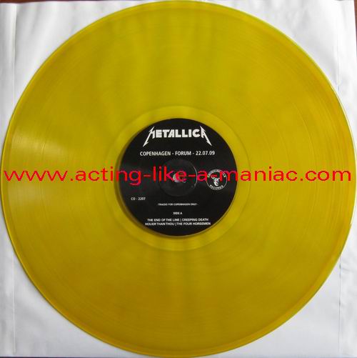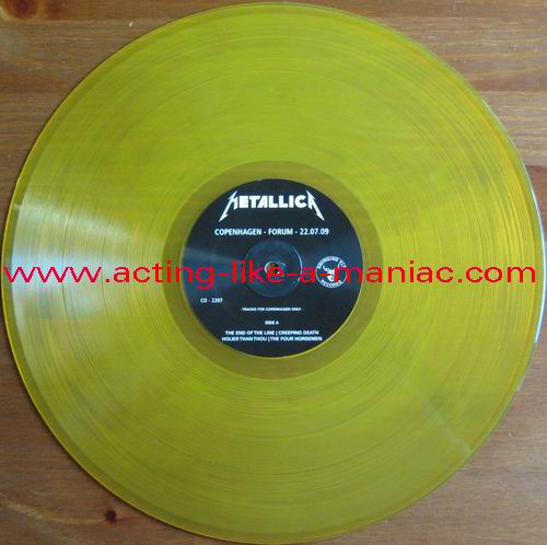 MISSPRESSED/ODD VERSIONS; clear yellow/brown marbled clear pink vinyl, scan taken from ebay.de white/pink vinyl, scan taken from ebay.de Type Of Vinyl: 1LP Country / Year: Coloured Vinyl; Europe/01/11/2009 Black Vinyl; Europe/23/11/2009 Company: The Swinging Elk Records Source / Date: Forum, Kopenhagen, Denmark, 22.07.2009 Matrix: No Matrix At All Track List: A. The End Of The Line, Creeping death, Holier Than Thou, The Four Horsemen B. The Unforgiven, The Day That Never Comes, Stone Cold Crazy