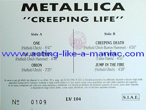 number #0109 (my copy) number #1069, scan taken from ebay.it number #1501, scan taken from ebay.com Type Of Vinyl: Picture LP Country / Year: Italy / 1994 Company: Cosmic Communications Source / Date: Live In Europe 92/93 & Unknown Show & Studio Tracks Matrix: LV 104 - A & LV 104 - B Track List: A. One, The Unforgiven, Orion B. Creeping Death , Am I Evil?, Jump In The Fire