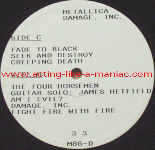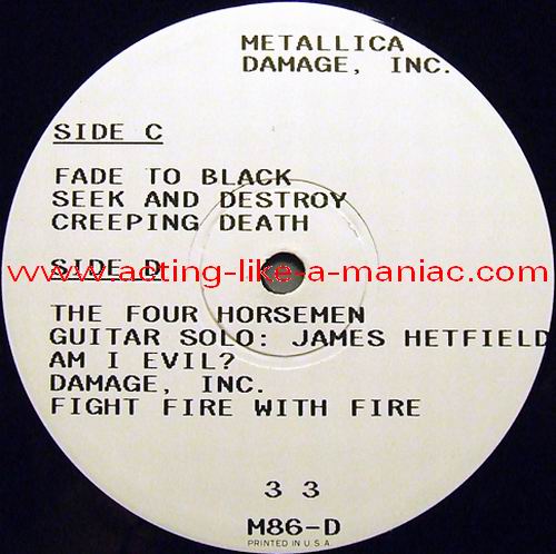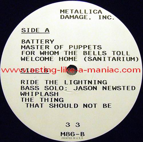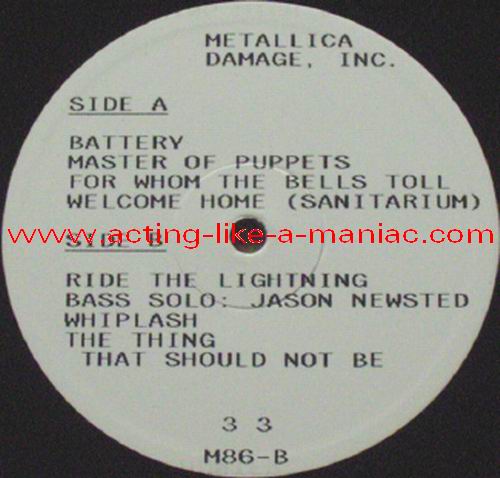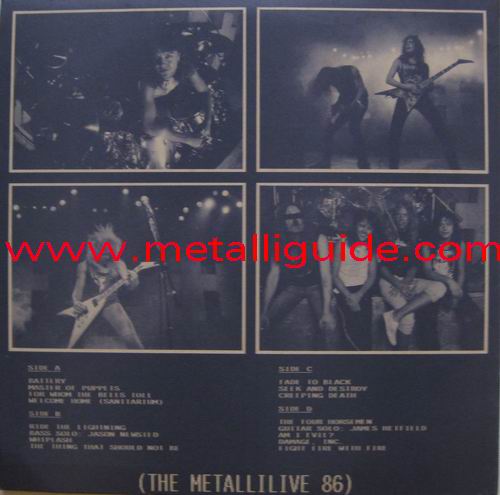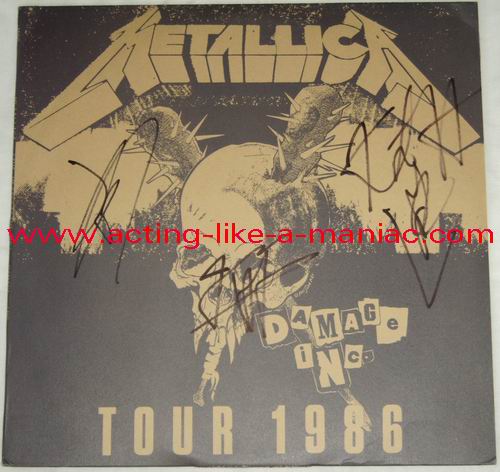 fully signed in Cologne, 26.10.88, Sporthalle, West Germany (scan from the collection of "Chris H.", many thanks) Type Of Vinyl: 2LP Country / Year: Japan/1987 Company: None Source / Date: Shibuya Kokaido, Tokyo, Japan, 15/11/86 Matrix: M 86 A & M 86 B & M 86 6 C & M 86 D (86; 1st record scratched, 2nd record stamped) Track List: A. Battery, Master Of Puppets, For Whom The Bell Tolls, Welcome Home B. The Thing That Should Not be, Ride The Lightning, Bass Solo, Whiplash C. Fade To Black, Seek And Destroy, Creeping Death D. The Four Horsemen, Guitar Solo, Damage Inc., Fight Fire With Fire