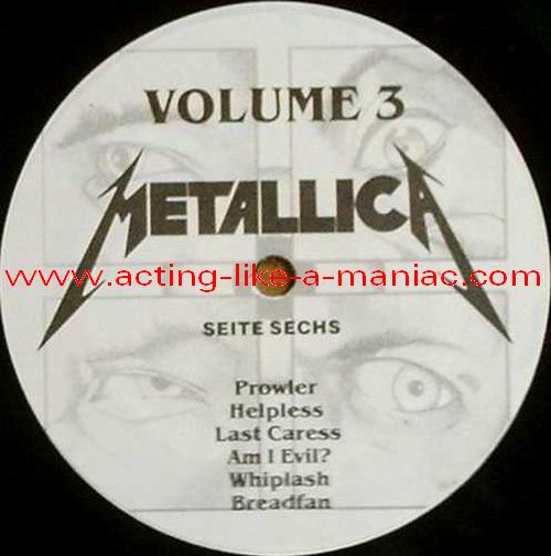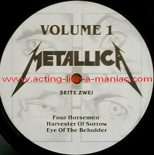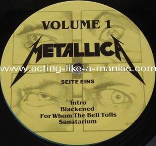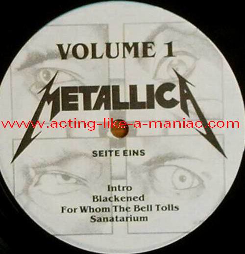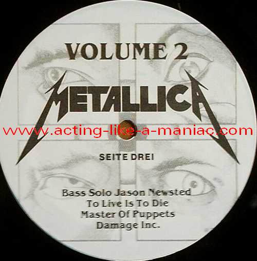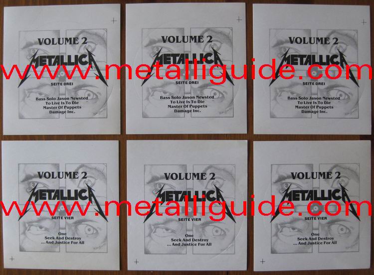 Notes: Comes with three coloured covers (yellow, red & blue). Also available with gray covers! There is also a "Volume 3" version with a gold "pushead label (side 5). This record has a yellow cover. The "Volume 1" text on front is deleted and changed to "Volume 3". The tracklist on back also is deleted and changed to the tracklist of the "Volume 3" cover. This copy is located in France, owned by "Metalfrog". Most of the Brazilian boots have "metallica" labels glued on other labels. About the green "vertigo" & "burton" labels; Those labels are stickers that were sold at record stores and skateboard or t-shirt stores back in the late 80's. They are the exact same size as a record label apparantely some people got the same idea to put them on some bootlegs (for fun, for profit??) They are definitely not printer or photocopied labels, but stickers.