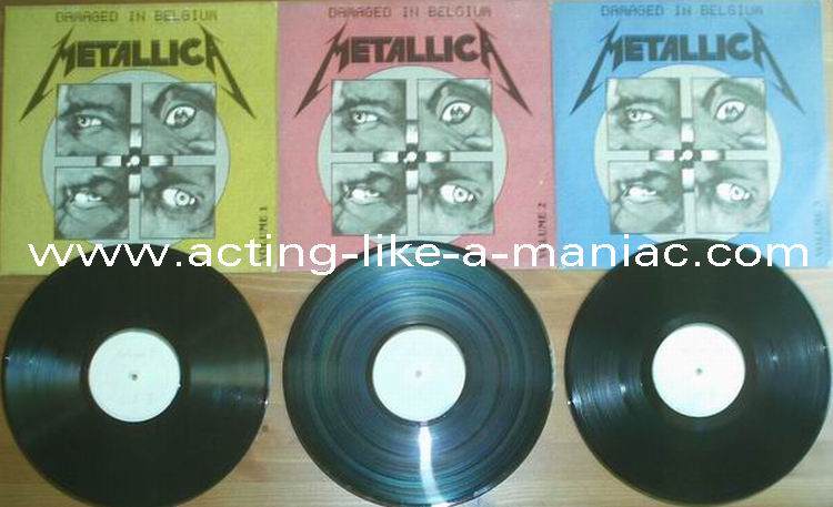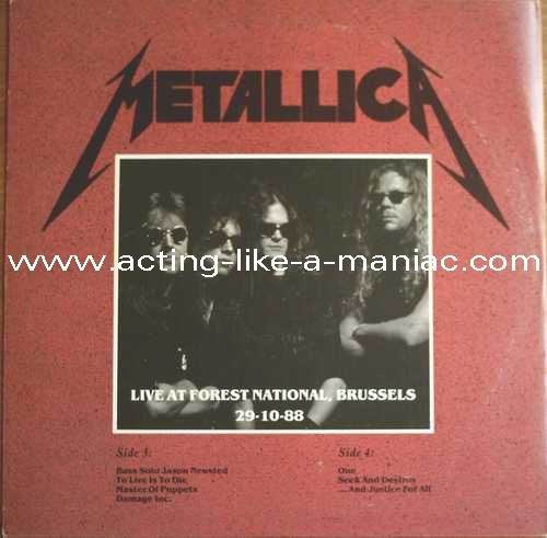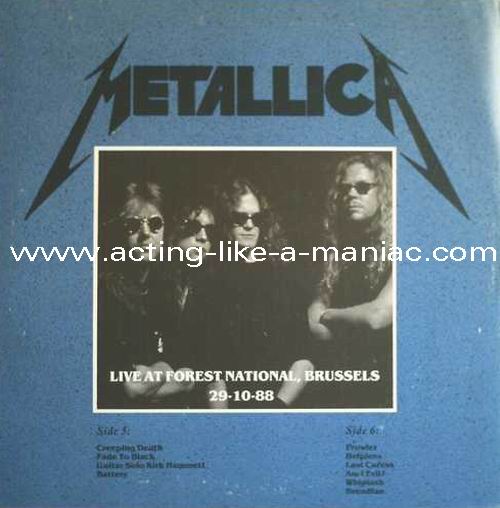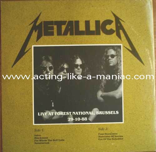 COLLECTOR´S PICTURES; 6 original labels (my copies) Type Of Vinyl: 3LP, 3 LP Set In Separate Covers (yellow cover, red cover & blue cover or with three gray covers) Country / Year: Brazil/1989 Company: None Source / Date: Brussels, Forest National, Belgium, 29/10/88 Matrix: Vol.1: side a: RP 001 A LL 389 side b: RP 001 B LL 389 Vol.2: side c: RP 002 A LL 389 side d: RP 002 B LL 389 Vol.3: side e: RP 003 A E 389 side f: RP 003 B F 389 Track List: A. Intro, Blackened, For Whom The Bell Tolls, Welcome Home B. The Four Horsemen, Harvester Of Sorrow, Eye Of The Beholder C. Bass Solo, To Live Is To Die, Master Of Puppets, Damage Inc. D. One, Seek And Destroy, And Justice For All E. Creeping Death, Fade To Black, Guitar Solo, Battery F. Prowler, Helpless, Last Caress, Am I Evil ?, Whiplash, Breadfan