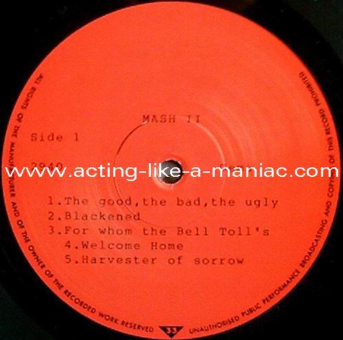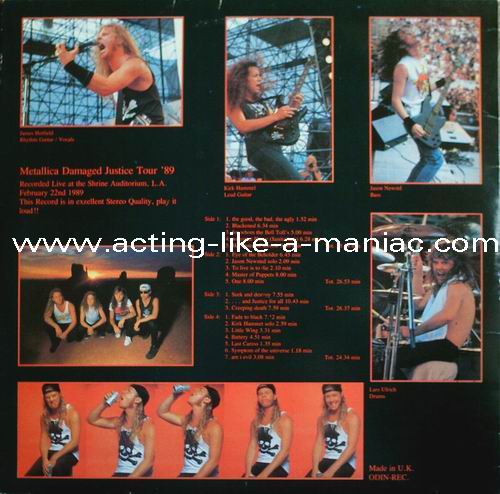 Type Of Vinyl: 2LP Country / Year: Germany/1990 Company: Odin Records Source / Date: Yoyogi Olympic Pool, Tokyo, Japan, 14/05/89 Matrix: 2940 - 1 & 2940 - 2 & 2940 - 3 & 2940 - 4 Track List: A. Intro, Blackened, For Whom The Bell Tolls, Welcome Home (Sanitarium), Harvester Of Sorrow B. Eye Of The Beholder, Bass Solo, Master Of Puppets, One C. Seek & Destroy, And Justice For All, Creeping Death D. Fade To Black, Guitar Solo, Battery, Last Caress, Am I Evil ?
