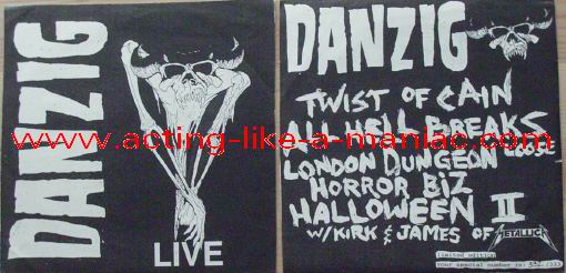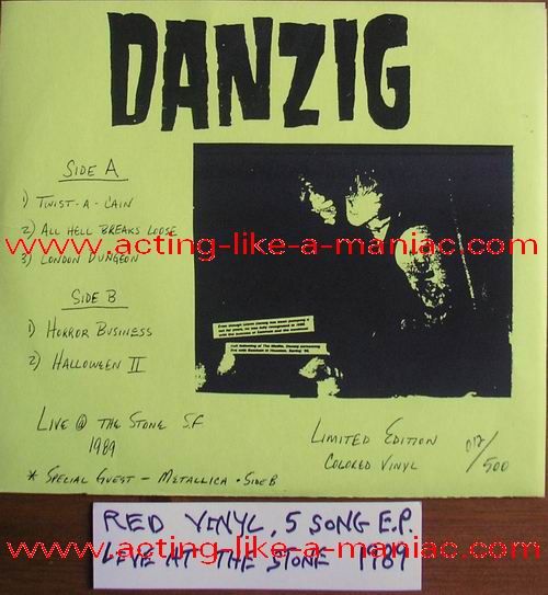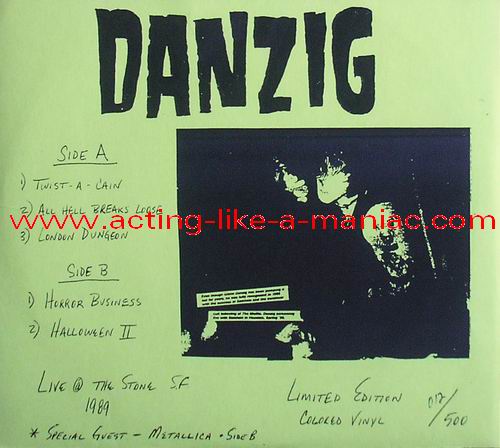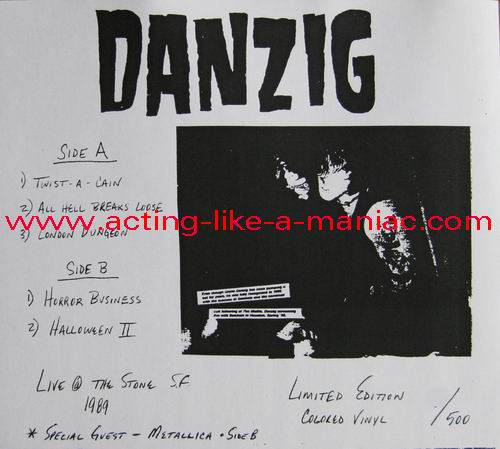 RECORD DETAILS; blue "danzig records" labels Type Of Vinyl: 7" Single Country / Year: USA/1989 Company: Danzig Records Source / Date: The Stone, San Francisco, USA 05/01/89 James Hetfield: Additional Vocals (Track 5) + Kirk Hammett: Additional Vocals (Track 5) Matrix: DR 1000 Track List: A. Twist Of Cain, All Hell, London Dungeon B. Horror Biz, Halloween II