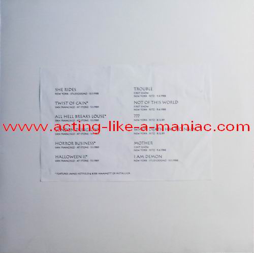Type Of Vinyl: LP Country / Year: Germany/1990 Company: None Source / Date: *The Stone, San Francisco, USA, 01/05/89 **Studio Outtake 1988 (Atlantic Recording) ***The Ritz, New York, USA, 09/04/88 ****The Ritz, New York, USA, 08/12/89 Matrix: & ME 0719/A 1 & & ME 0720/A 6 & ME 0719/A 1 & & ME 0720/A 8 & ME 0719/A 5 & & ME 0720/A 9 & ME 0719/A 5 & & ME 0720/A 8 Track List: A. She Rides**, Twist Of Cain*, All Hell Breaks Loose*, London Dungeon*, Horror Business*, Halloween II* B. Trouble***, Not Of This World***, 777****, When Death Had No Name****, Am I Deamon**