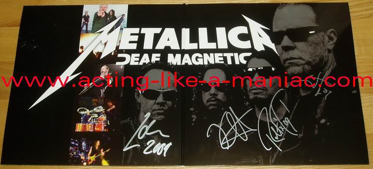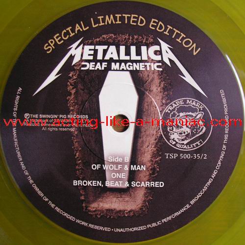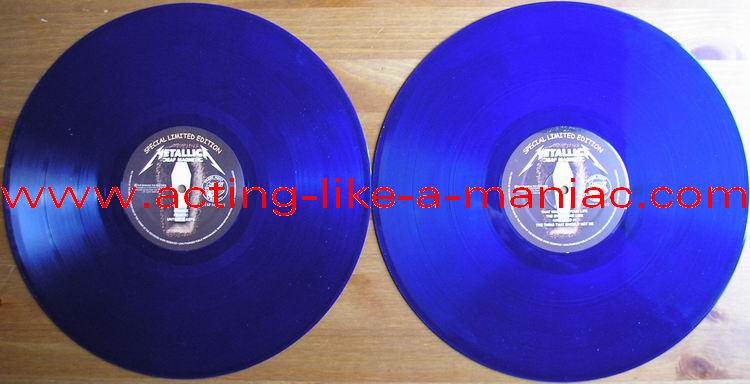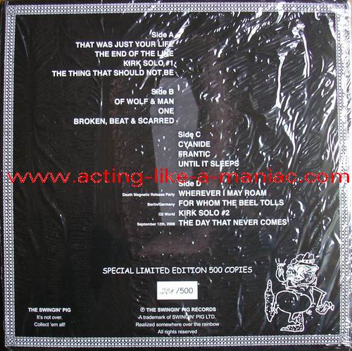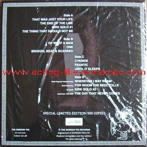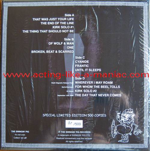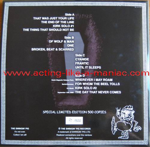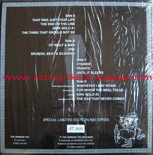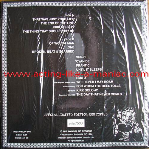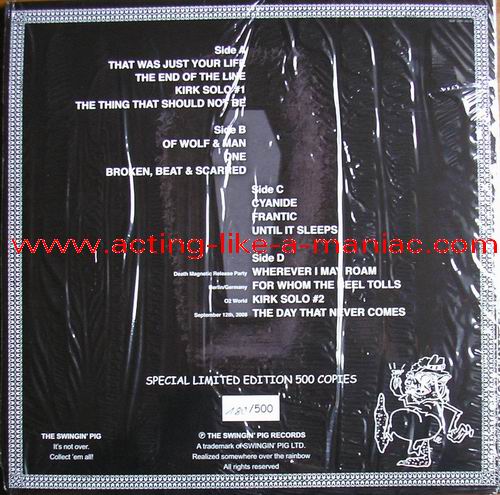 blue vinyl, fully signed in 2009, Cologne, Germany (owned by "Oli a.k.a. FuckThePosers") Type Of Vinyl: 2LP Gatefold "Gimmick" Cover Country / Year: Germany/Luxembourg/15/02/09 Company: The Swingin' Pig Records / Swingin' Pig LTD. Source / Date: O2 World World, Berlin, Germany, 12/09/08 Matrix: No Matrix At All Track List: A. That Was Just Our Life, The End Of The Line, Kirk Solo #1, The Thing That Should Not Be B. Of Wolf And Man, One, Broken, Beat & Scarred C. Cyanide, Frantic, Until It Sleeps D. Wherever I May Roam, For Whom The Bell Tolls, Kirk Solo #2, The Day That Never Comes