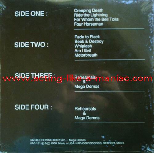 clear translucent green & brown vinyl, scan from the collection of Metalfrog, many thanks Type Of Vinyl: 2LP Country / Year: USA/1987 Company: Kabjdo Records Source / Date: *Donington, Donington Park, England, 17/08/85 **"Ride The Lightning" Demos 09/1983 ***Megadeth Demos 1984 Matrix: KAB-101-A & KAB-101-B & KAB-101-C & KAB-101-D Track List: A. Intro*, Creeping Death*, Ride The Lightning*, For Whom The Bell Tolls*, The Four Horsemen* B. Fade To Black*, Seek And Destroy*, Whiplash*, Am I Evil ?*, Motorbreath* C. Ride The Lightning**, Call Of Ktulu**, Creeping Death** D. Fight Fire With Fire**, The Mechanix**, Loved To Death***, Skull Beneath The Skin***