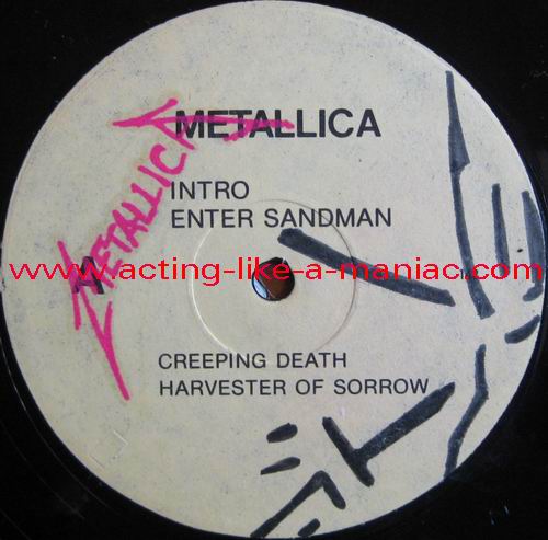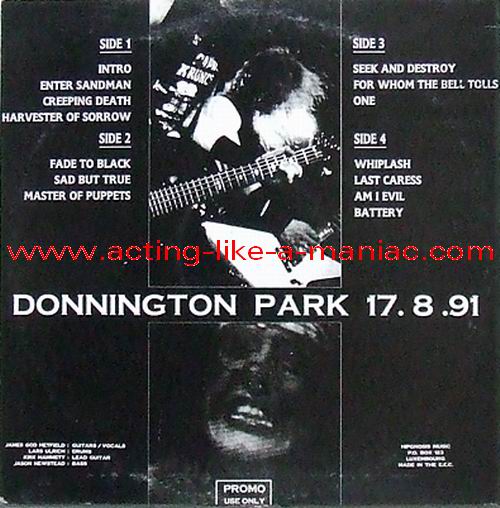 First Version; - black/white (dark) cover (glossy/shiny cover) with reddish photo & white lettering on it - photo on the cover a bit blurred compared to original - white spine with "•METALLICA - DEATHAMP" on top - records with pink labels inside, with tracklisting & "142" on them Second Version; - light gray cover (dull cover) with greenish photo & white lettering on it - photo on the cover a bit blurred compared to original - white spine with "III•METALLICA - DEATHAMP" on top - records with yellow labels inside, with tracklisting & "142" on them Type Of Vinyl: 2LP Country / Year: Korea/mid 90's Company: Hipgnosis Music Source / Date: Donington, Donington Park, England, 17/08/91 Matrix: MIDD . I . A1 142 ~ A & MIDD . I . B1 142 ~ B & MID'D - I - C1 142 ~ C & MID'D - I - D1 142 ~ D Track List: A. Intro, Enter Sandman, Creeping Death, Harvester Of Sorrow B. Fade To Black, Sad But True, Master Of Puppets C. Seek And Destroy, For Whom The Bell Tolls, One D. Whiplash, Last Caress, Am I Evil ?, Battery