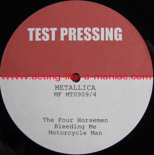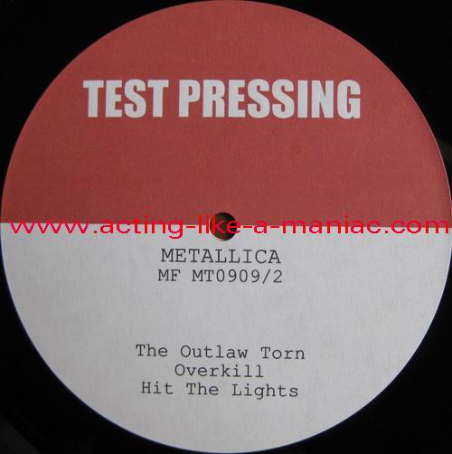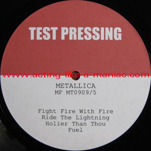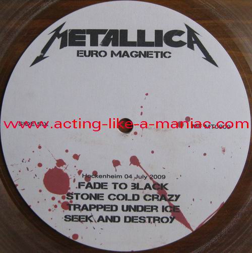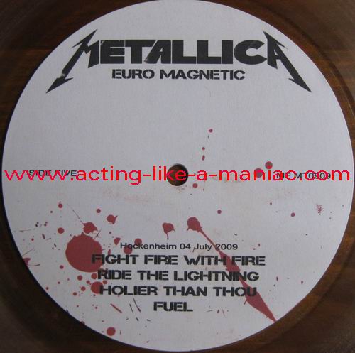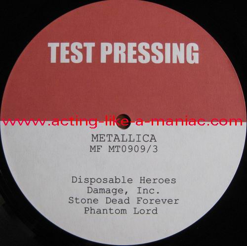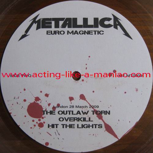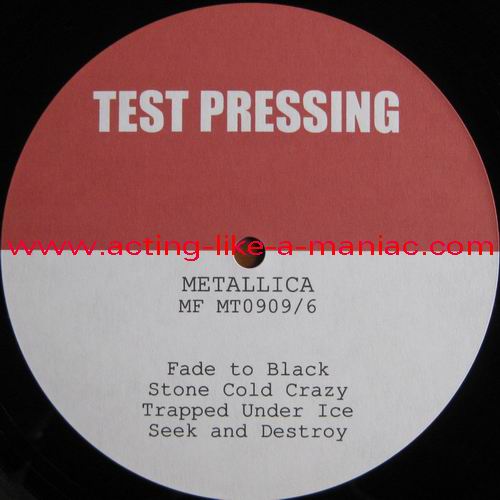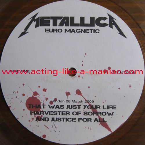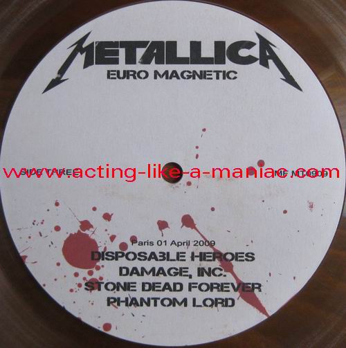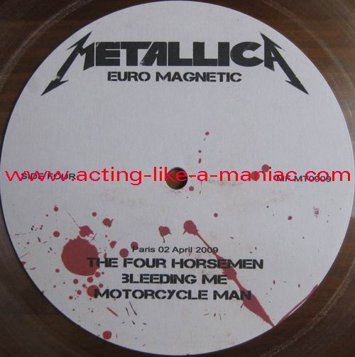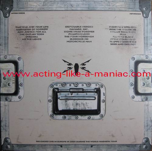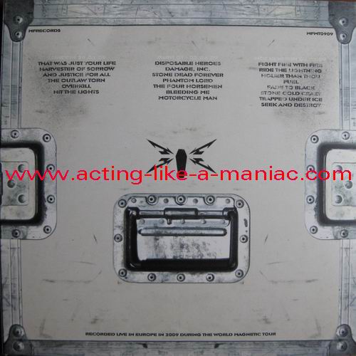 testpressing, unlabeled on record 2 (c-side) Type Of Vinyl: 3LP + 2CD-R Country / Year: 1st Pressing; France/16/09/2009 2nd Pressing; France/2010 Company: MFRECORDS MF MT0909 Source / Date: record one; London, England, 28/03/09 record two; Paris, France, 01 & 02/04/09 record three; Hockenheim, Germany, 04/07/09 Matrix: No Matrix At All (acetate bootleg) Track List: A. That Was Just Your Life, Harvester Of Sorrow, And Justice for All B. The Outlaw Torn, Overkill, Hit The Lights C. Disposable Heroes, Damage, Inc., Stone Dead Forever D. Phantom Lord, The Four Horsemen, Bleeding Me, Motorcycle Man E. Fight Fire With Fire, Ride The Lightning, Holier Than Thou, Fuel F. Fade to Black, Stone Cold Crazy, Trapped Under Ice, Seek and Destroy