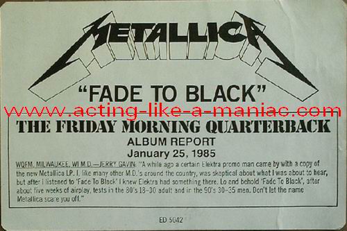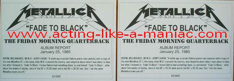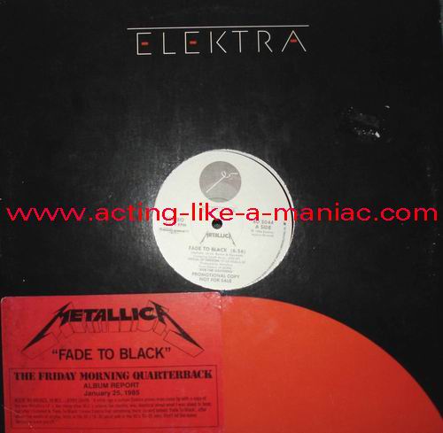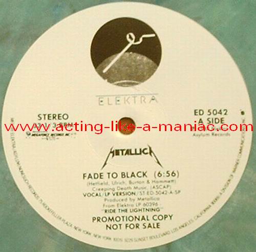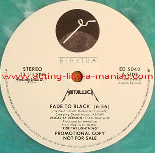 BOOTLEG STICKER; first issue of the white bootleg sticker (this sticker was originally on the bootleg copies) reissue of the white bootleg sticker (this sticker was available separately, approx. 30 copies made) Type Of Vinyl: 12" Country / Year: Original: USA/1985 Bootleg: Germany/1989 Company: Original: Elektra Bootleg: "Elektra" Matrix: Original: (green vinyl) ST-ED.5042.A.1 & ST-ED.5042.A.1 (black vinyl) ST-ED-5042-A- SP or ST-ED-5042-A- AR Bootleg: ST-ED-5042-A & ST-ED-5042-A Track List: A. Fade To Black B. Fade To Black