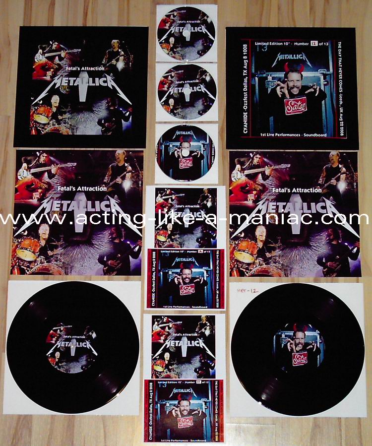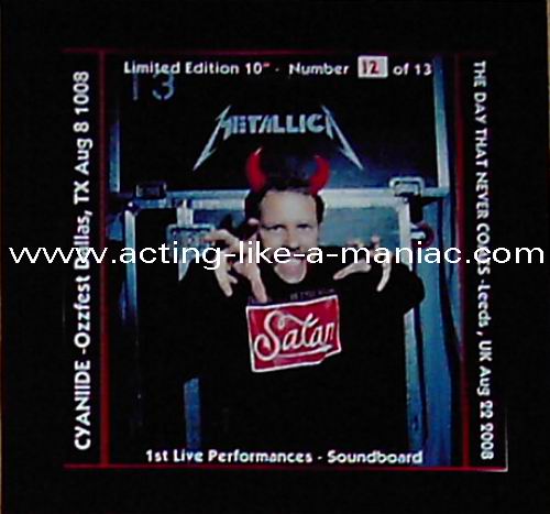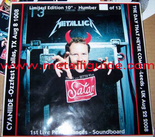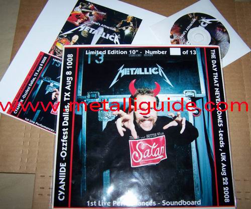 unnumbered, scans taken from ebay.com Type Of Vinyl: 10" Metal/Lacquer Plate Country / Year: Norway/USA / 11/2008 Company: None Source / Date: Ozzfest, Dallas, USA, 09/08/08 (a-side) & Leeds, England, 22/08/08 (b-side) Matrix: MET08 -10 -13 (a-side) or no matrix at all Track List: A. Cyanide (First Live Version) B. That Day That Never Comes (First Live Version)