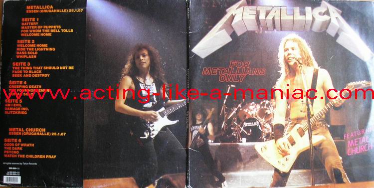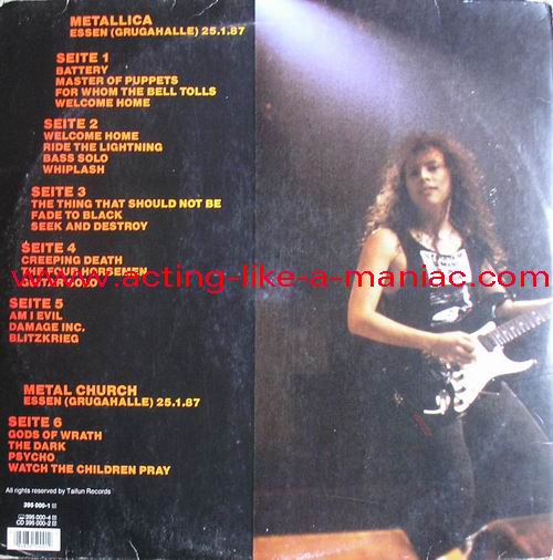 LABEL DETAILS; Type Of Vinyl: 3LP Gatefold Cover Country / Year: Germany/1987 Company: Taifun Records Source / Date: Grugahalle, Essen, Germany, 25/01/87 Matrix: First Record: 210 008 - A & 210 008 - B Second Record: 210 009 - C & 210 009 - D Third Record: 210 009 - E- & 210 009 - F Track List: A. Metal Church (side a): Gods Of Wrath, The Dark, Psycho, Watch The Children Pray B. Intro, Battery, Master Of Puppets, For Whom The Bell Tolls C. Welcome Home (Sanitarium), Ride The Lightning, Bass Solo, Whiplash D. The Thing That Should Not Be, Fade To Black, Seek And Destroy E. Creeping Death, The Four Horsemen, Guitar Solo F. Am I Evil?, Damage Inc., Blitzkrieg