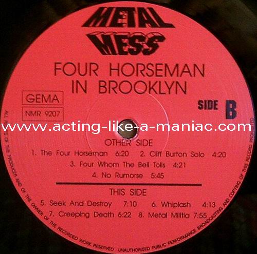 Type Of Vinyl: LP Country / Year: Germany/1992 Company: Metal Mess Source / Date: The Lyceum Ballroom, London, England, 20/12/84 Matrix: MMR-9107-A & MMR-9107-B Track List: A. The Four Horsemen, Bass Solo, For Whom The Bell Tolls, No Remorse B. Seek And Destroy, Whiplash, Creeping Death, Guitar Solo, Metal Militia
