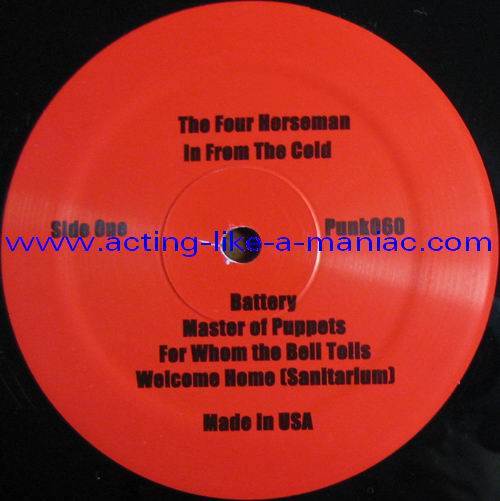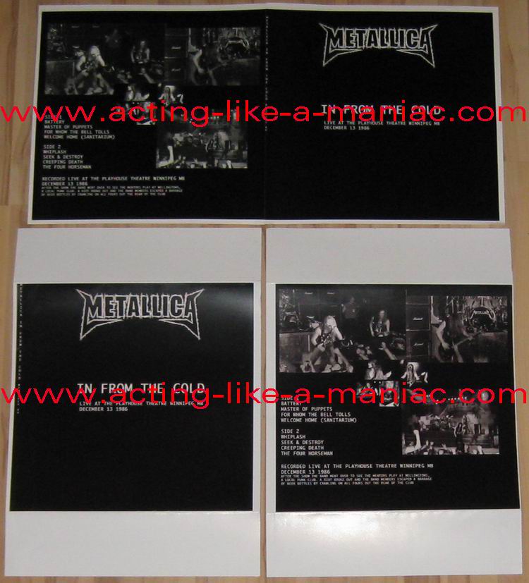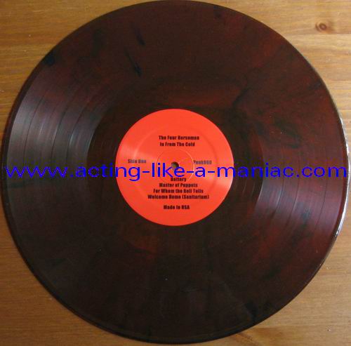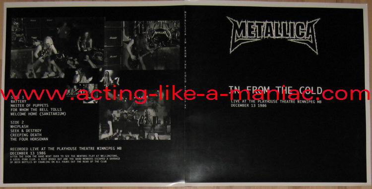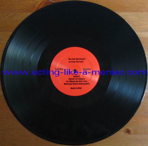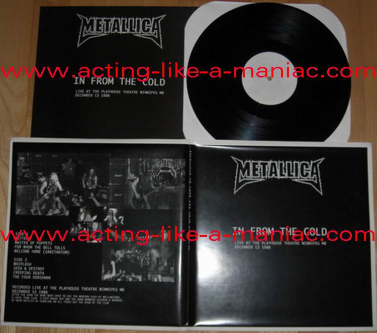 black/white vinyl, scan from the collection of "Chris Heinke", many thanks white/pink vinyl, scan taken from ebay.com Type Of Vinyl: LP Country / Year: Test Pressing; Canada/USA / 09/08/09 Regular Versions; Canada/USA / 25/08/09 Company: None Source / Date: Playhouse Theatre, Winnipeg, Canada, 13/12/86 Matrix: PUNK-060-A ~ & PUNK-060-B ~ Track List: A. Battery, Master Of Puppets, For Whom The Bell Tolls, Welcome Home (Sanitarium) B. Whiplash, Seek And Destroy, Creeping Death, The Four Horsemen