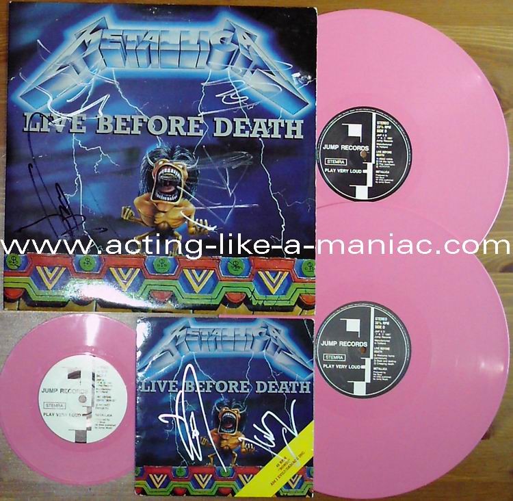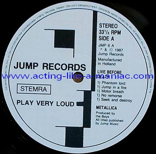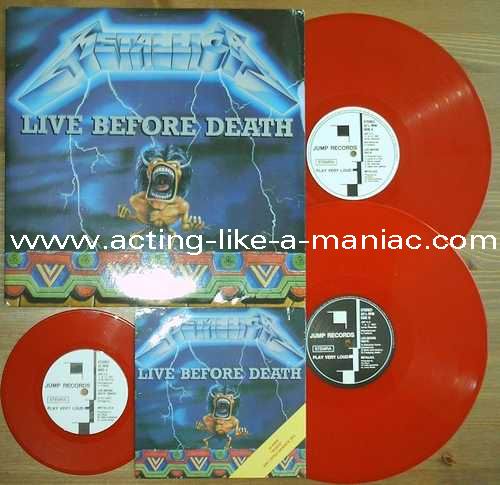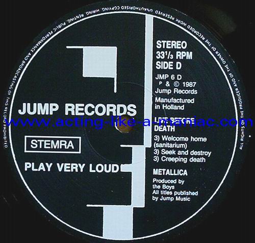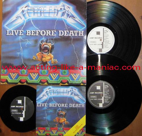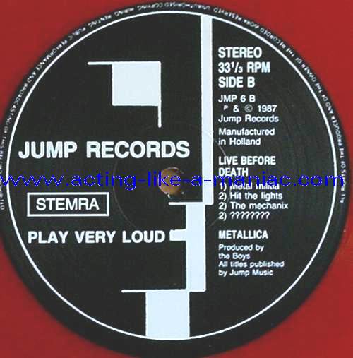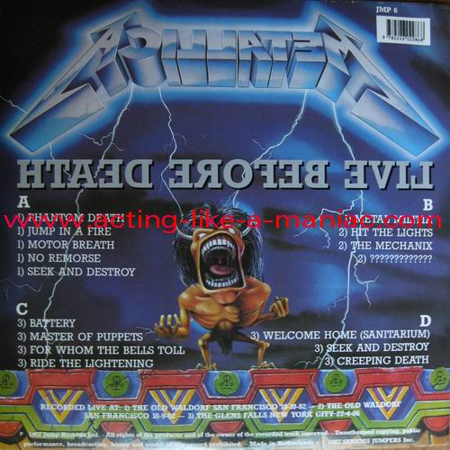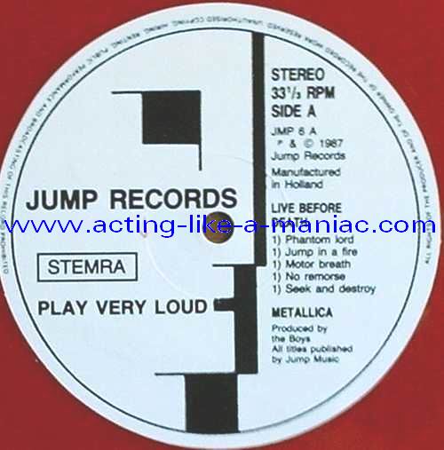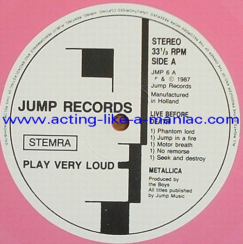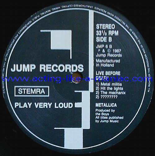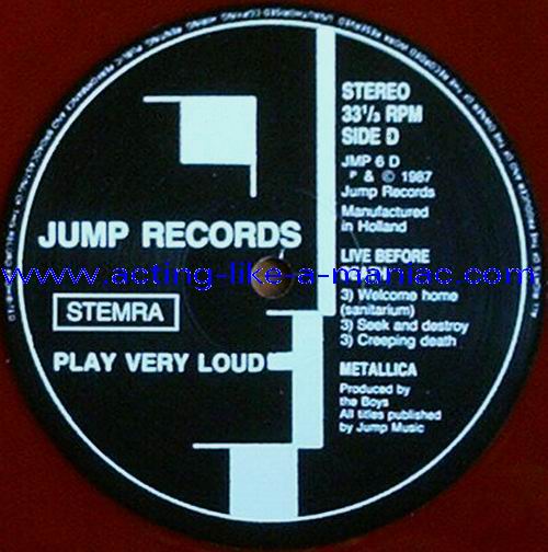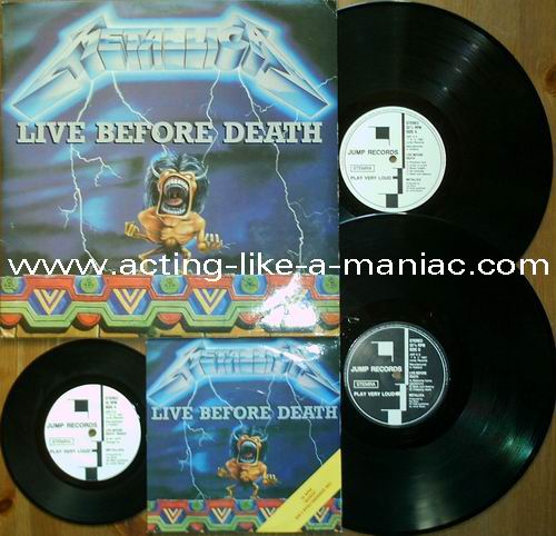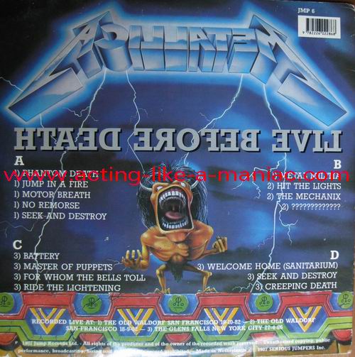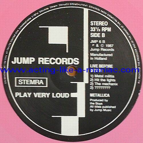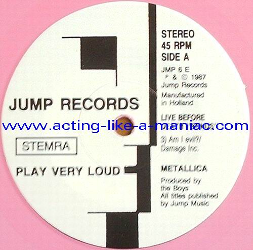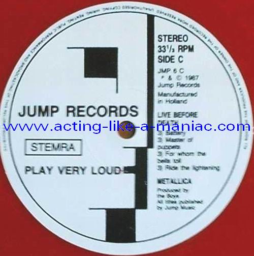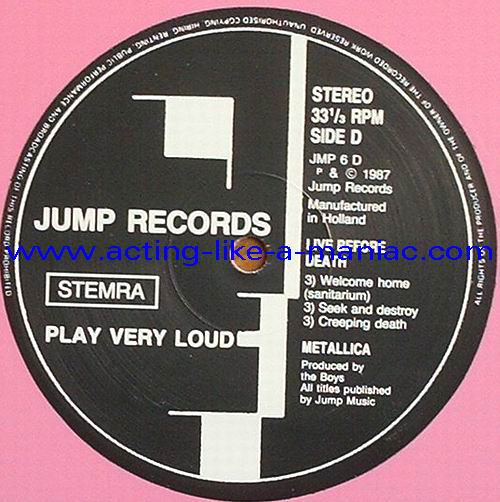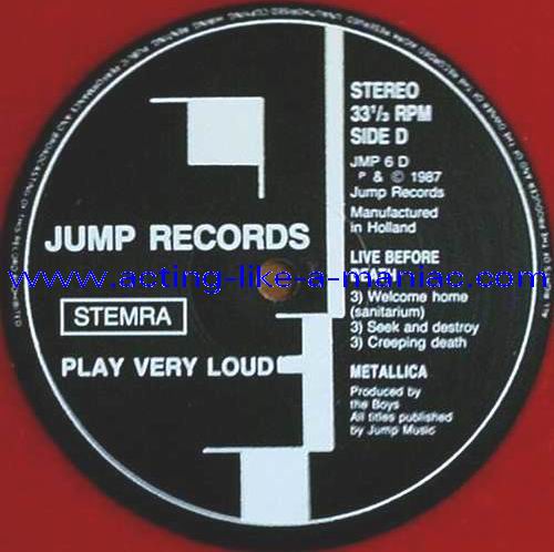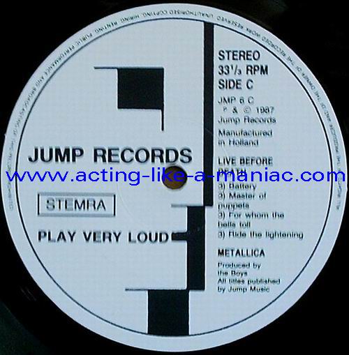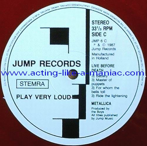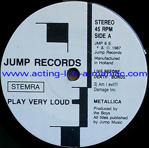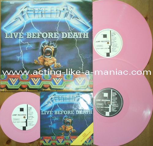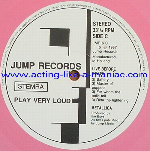 pink vinyl with neutral white labels Type Of Vinyl: 2LP & 7" Single Country / Year: Holland/1987 Company: Jump Records Source / Date: *The Old Waldorf, San Francisco, USA, 18/10/82 **The Stone, San Francisco, USA, 18/09/82 ***Civic Center, Glenn Falls, USA, 27/04/86 Matrix: Double LP: JMP 6 (A) & JMP 6 (B) & JMP 6 (C) & JMP 6 (D) 7" Single: JMP 6 BONUS & No Matrix (side b is totally blank) Track List: Double LP A. Phantom Lord*, Jump In The Fire*, Motorbreath*, No Remorse*, Seek & Destroy* B. Metal Militia*, Hit The Lights**, The Mechanics**, The Prince** C. Battery***, Master Of Puppets***, For Whom The Bell Tolls***, Ride The Lightning*** D. Welcome Home (Sanitarium)***, Seek & Destroy***, Creeping Death*** 7" Single A. Am I Evil?**, Damage Inc.** B. None, The Record Is Blank DOUBLE LP