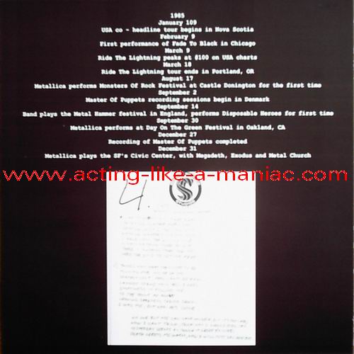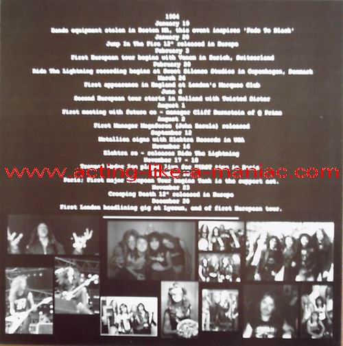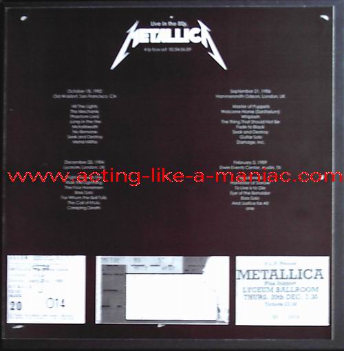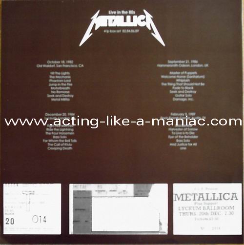 light blue-yellow vinyl, yellow vinyl with whit/gray label, baby blue vinyl & white vinyl, (number #1/150), scans from the collection of "Oli", many thanks Type Of Vinyl: 4LP Box Set Country / Year: Europe/24/09/2008 Company: None Source / Date: First Record (Aqua Vinyl): San Francisco, Old Waldorf, USA, 18/10/82 Second Record (Yellow Vinyl): Lyceum, London, England, 20/12/84 Third Record (Baby Blue Vinyl): Hammersmith Odeon, London, England, 21/09/86 Fourth Record (White Vinyl): Erwin Events Center, Austin, USA, 03/02/89 Matrix: First Record (Aqua Blue Vinyl): ML 82 - II A & ML 82 - 2I Second Record (Yellow Vinyl): MET 84 AI & MET 84 BI Third Record (Baby Blue Vinyl): MET 86 AI & MET 86 BI Fourth Record (White Vinyl): MET 89 AI & MET 89 BI Track List: First Record: A. Hit The Lights, The Mechanix, Phantom Lord, Jump In The Fire B. Motorbreath, No Remorse, Seek And Destroy, Metal Militia Second Record; A. Fight Fire With Fire, Ride The Lightning, The Four Horsemen, Bass Solo B. For Whom The Bell Tolls, The Call Of Ktulu, Creeping Death Third Record; A. Master Of Puppets, Welcome Home (Sanitarium), Whiplash, The Thing That Should Not Be B. Fade To Black, Seek And Destroy, Guitar Solo, Damage Inc. Fourth Record; A. Blackened, Harvester Of Sorrow, To Live Is To Die, Eye Of The Beholder B. Bass Solo, And Justice For All, One