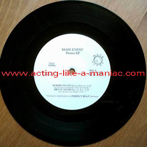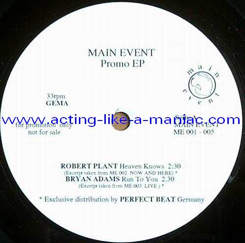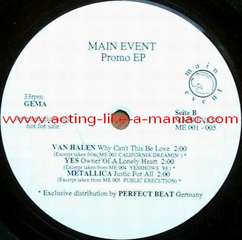 RECORD DETAILS; LABEL DETAILS; Type Of Vinyl: 7" Single Country / Year: Germany/1992 Company: Main Event Source / Date: *Providence, Civic Center, USA, 23/02/89 (only the metallica song) Matrix: ME-005 A G.P. & ME-005 B G.P. Track list: A. Heaven Knows (Robert Plant), Run To You (Bryan Adams) B. Why Can't This Be Love (Van Helen), Owner Of A Lonely Heart (Yes), ...And Justice For All (Metallica)*