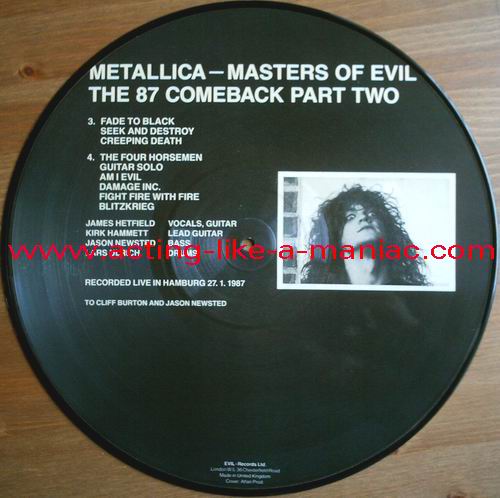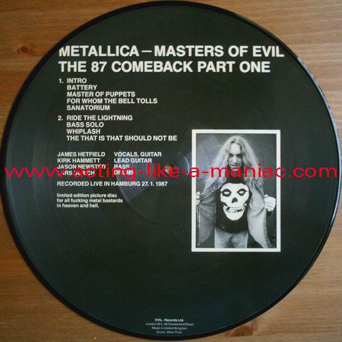 picture disc with cut Type Of Vinyl: 2 Picture Disc Set Country / Year: Germany/1990 Company: Evil Records Source / Date: Markthalle, Hamburg, Germany, 27/01/87 Matrix: MT 1 - A & MT 1 - B & MT 1 - C & MT 1 - D Track List: A. Intro, Battery, Master Of Puppets, For Whom The Bell Tolls, Welcome Home (Sanitarium) B. Ride The Lightning, Bass Solo, Whiplash, The Thing That Should Not Be C. Fade To Black, Seek And Destroy, Creeping Death D. The Four Horsemen, Guitar Solo, Am I Evil?, Fight Fire With Fire, Blitzkrieg HERE ARE THE DIFFERENCES BETWEEN THE FIRST VERSION & SECOND VERSION; DIFFERENCES; 1 first: 1st press second: 2nd press 1 the colours of the reissue are darker/more intensive