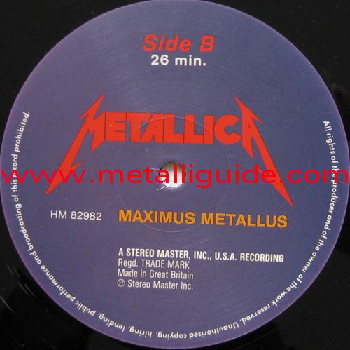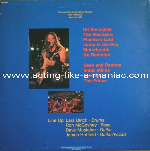 Type Of Vinyl: LP Country / Year: England/1988 Company: Stereo Master Inc. Source / Date: The Stone, San Francisco, USA, 18/09/82 Matrix: HM 82982-A & HM 82982-B Track List: A. Hit The Lights, The Mechanics, Phantom Lord, Jump In The Fire, Motorbreath, No Remorse B. Seek And Destroy, Metal Militia, Am I Evil ?, The Prince