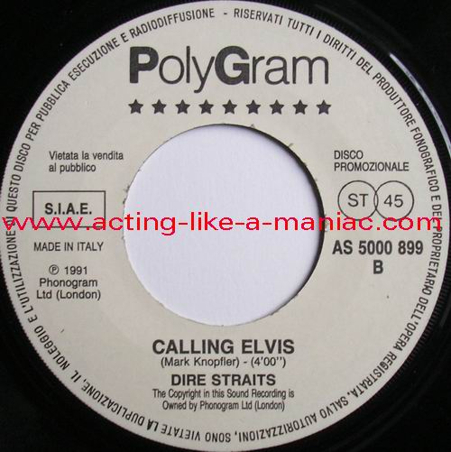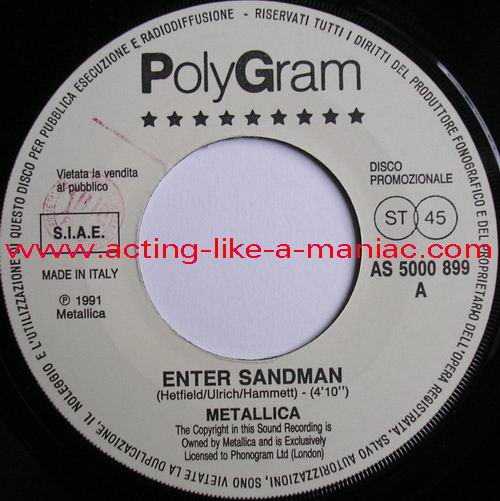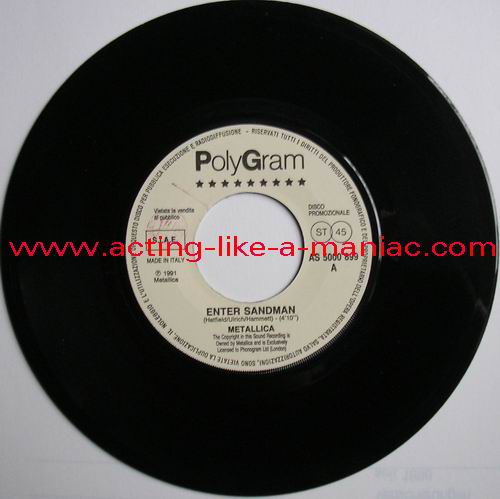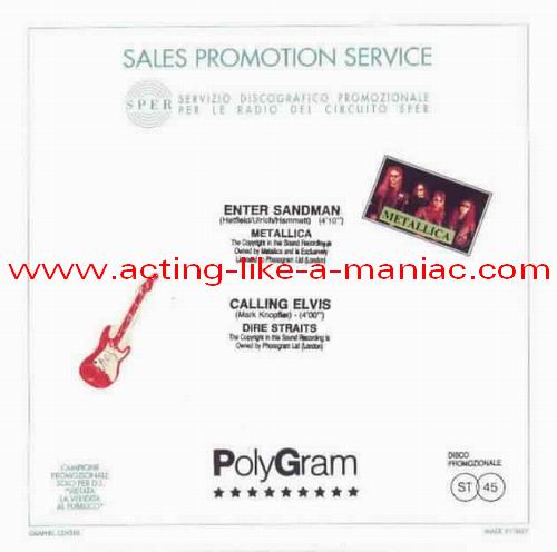 Type Of Vinyl: 7" Single Country / Year: Italy/1991 Company: "PolyGram"/SPER Source / Date: Taken From The Official Albums of Metallica & Dire Straits Matrix: 5000899 1 & 5000899 2 Track List: A. Enter Sandman (Metallica) B. Calling Elvis (Dire Straits)