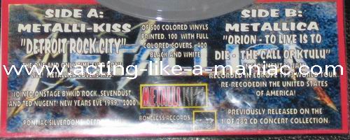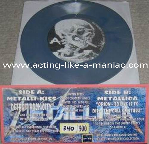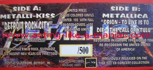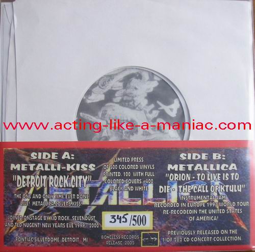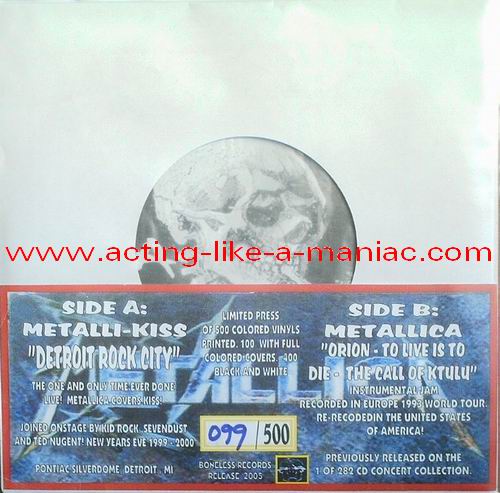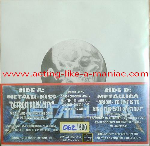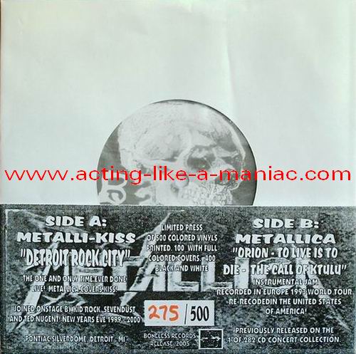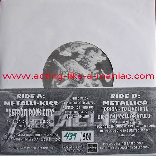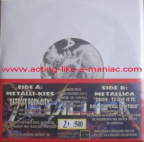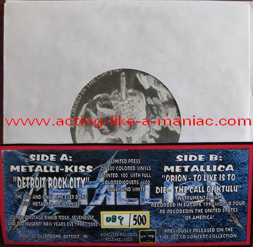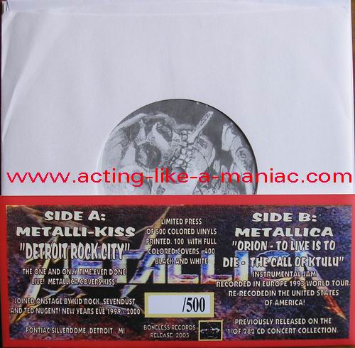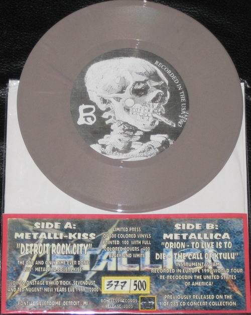 dark gray/brown marbled with blue & pink spots (misspress), coloured cover, numbered: #379/500 Type Of Vinyl: 7" Single Country / Year: USA/2005 Company: Boneless Records Source / Date: *Pontiac Silverdom, Detroit, USA, 31/12/99 **The National Bowl, Milton Keynes, England, 05/06/93 Matrix: BR 0501 - A & BR - 0501 - B Track List: A. Detroit Rock City* B. Orion**, To Live Is To Die**, The Call Of Ktulu**