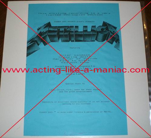 MATRIX DETAILS; (scans from the collection of Dante, many thanks) Type Of Vinyl: LP Country / Year: Holland/1993 Company: Rubber Duck Records Source / Date: Gentofte Stadion, Copenhagen, Denmark, 08/10/91 Matrix: Track List: A. Enter Sandman, Creeping Death, Harvester Of Sorrow, Fade To Black, Sad But True B. Master Of Puppets, Seek And Destroy, For Whom The Bell Tolls, One, Whiplash
