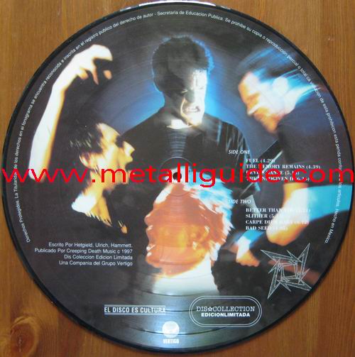 Notes: Picture disc has 8 tracks on back, but it plays 13 tracks. It's the same pressing as the "canadian" version, but with diff. pictures on it. The front picture also is different to the 1st "mexico" version. Record miss spells; "hetGield", "The Unfogiven II & "Carpe Diem Baby".