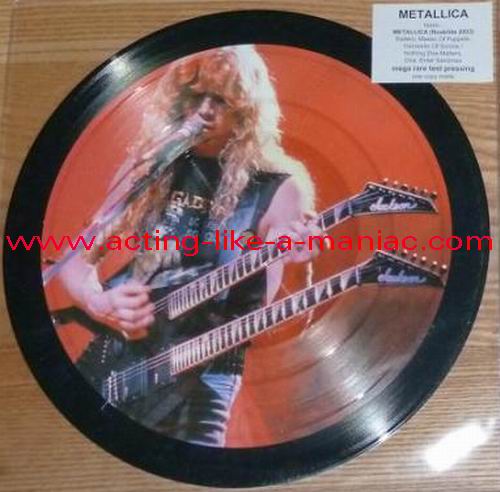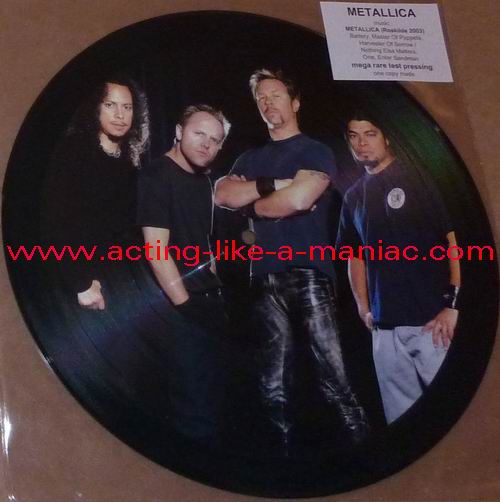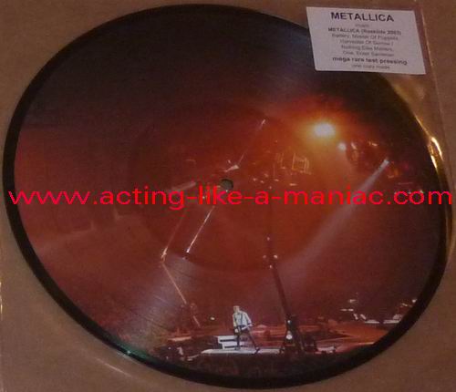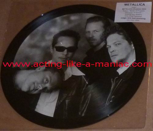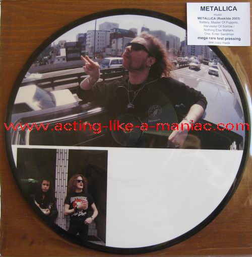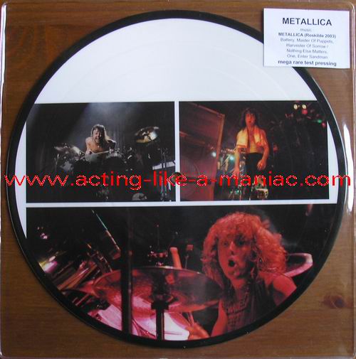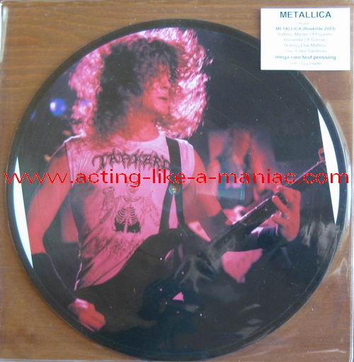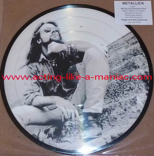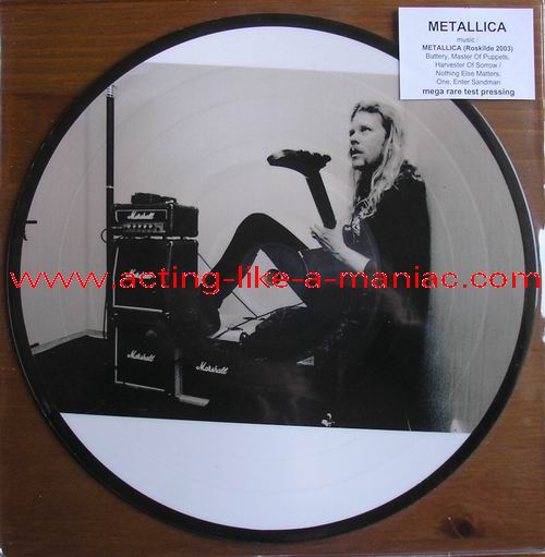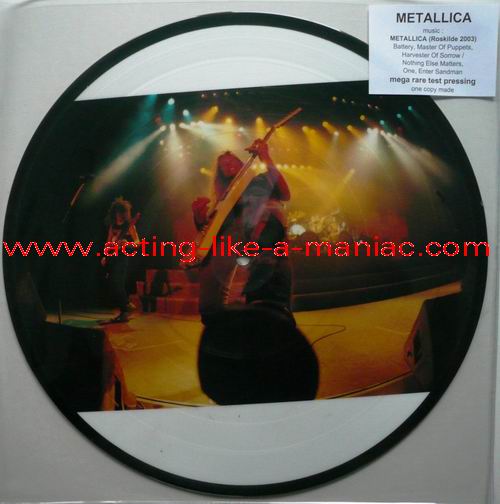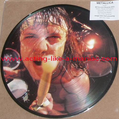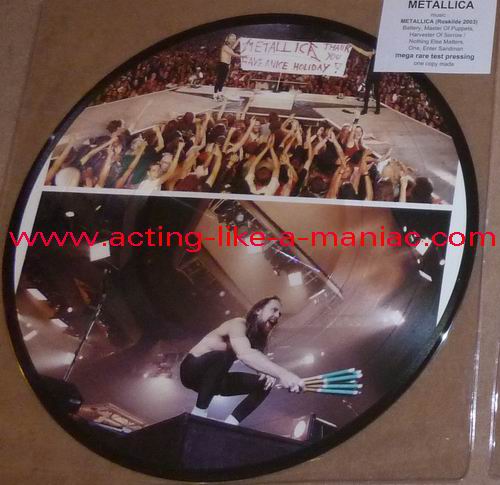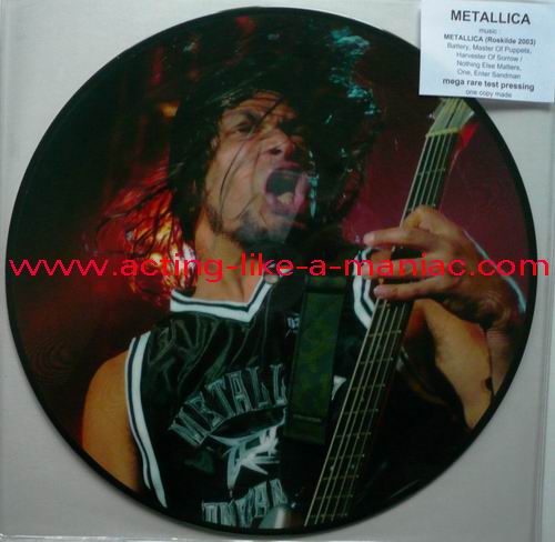 owned by "FuckThePosers" Type Of Vinyl: 10" Picture Disc Country / Year: Europe/late 02/09 - 07/10 Company: None Source / Date: Roskilde Festival, Roskilde, Denmark, 26/06/03 Matrix: No Matrix At All Track List: A. Battery, Master Of Puppets, Harvester Of Sorrow B. Nothing Else Matters, One, Enter Sandman