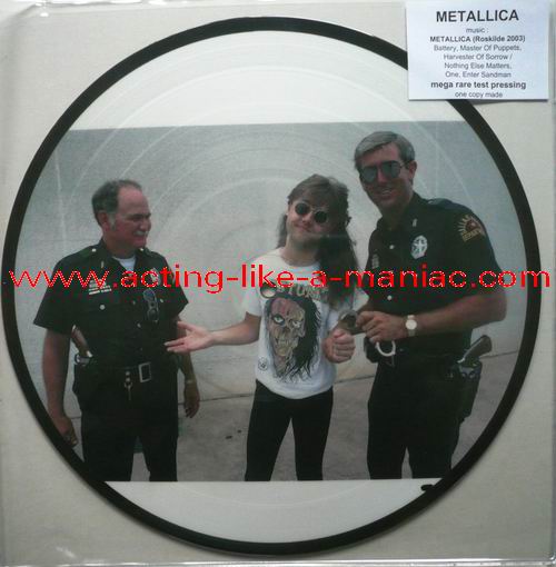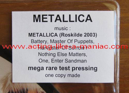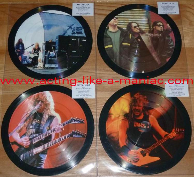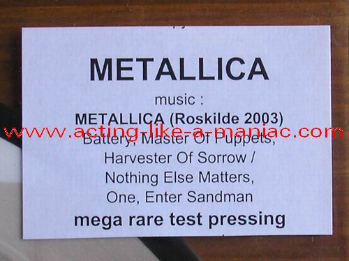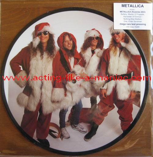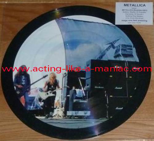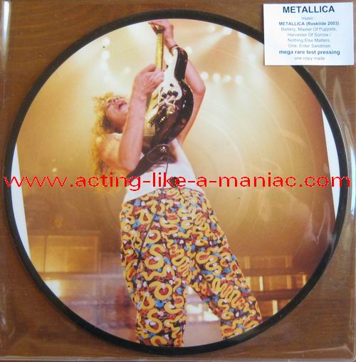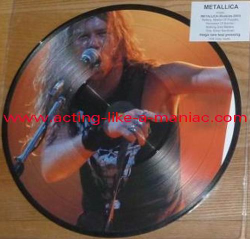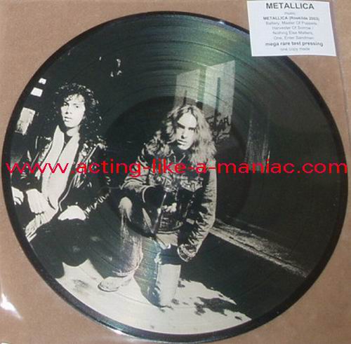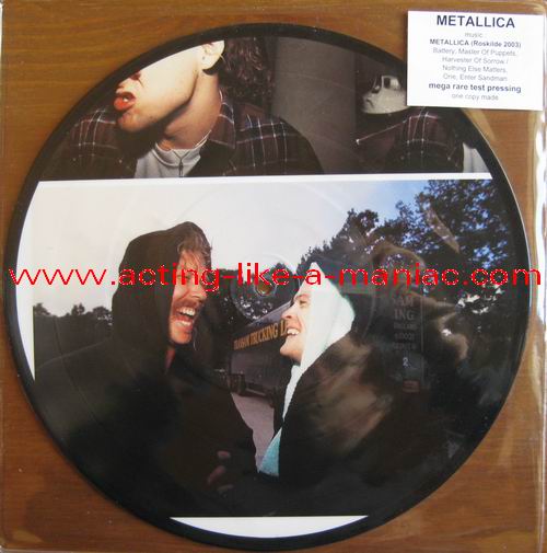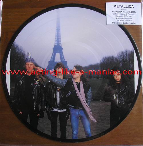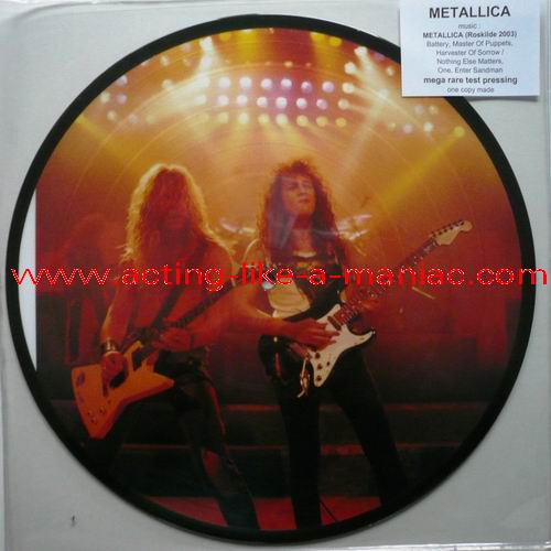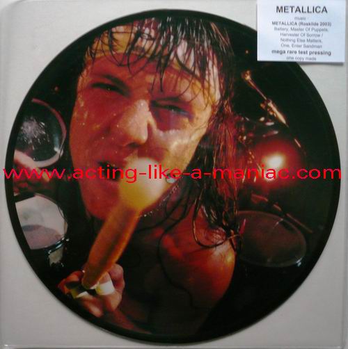 owned by "FuckThePosers" Type Of Vinyl: 10" Picture Disc Country / Year: Europe/late 02/09 - 07/10 Company: None Source / Date: Roskilde Festival, Roskilde, Denmark, 26/06/03 Matrix: No Matrix At All Track List: A. Battery, Master Of Puppets, Harvester Of Sorrow B. Nothing Else Matters, One, Enter Sandman