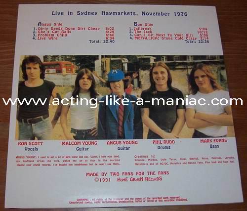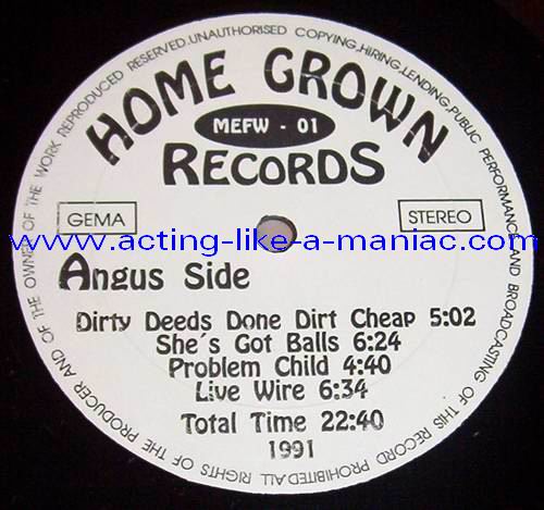 Type Of Vinyl: LP Country / Year: Germany/1991 Company: Home Grown Records Source / Date: *Haymarkets; Sydney, Australia, 1976 **Studio Outtake, 1990 Matrix: AC-1 & AC-2 Track list: A. Dirty Deeds Done Dirt Cheap*, She's Got Balls*, Problem Child*, Live Wire* B. Jailbreak*, The Jack*, Can I Sit Next To You Girl*, Stone Cold Crazy**