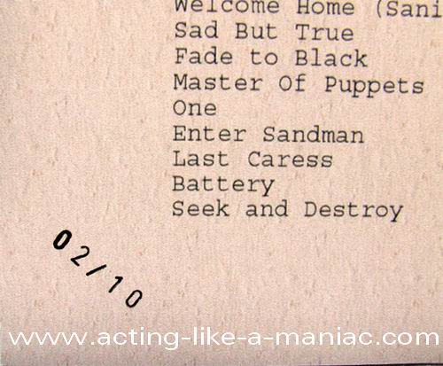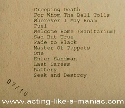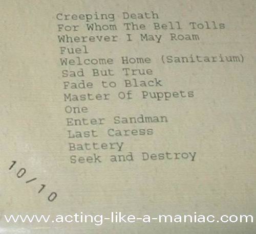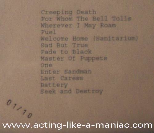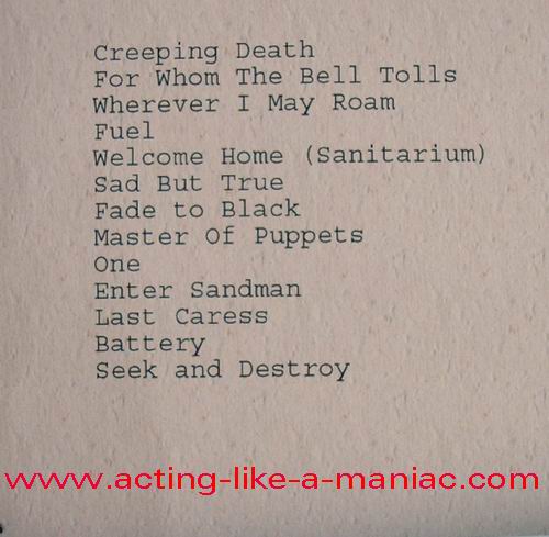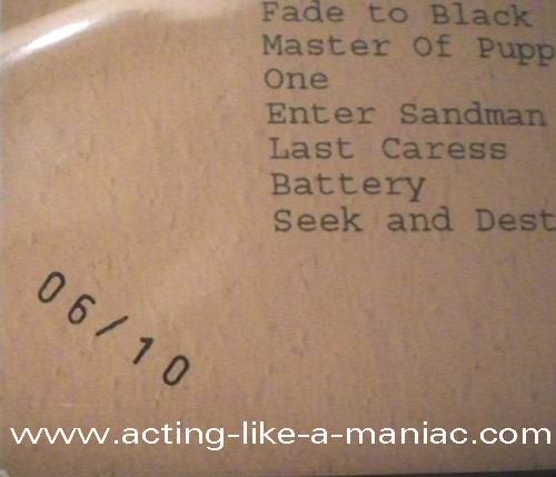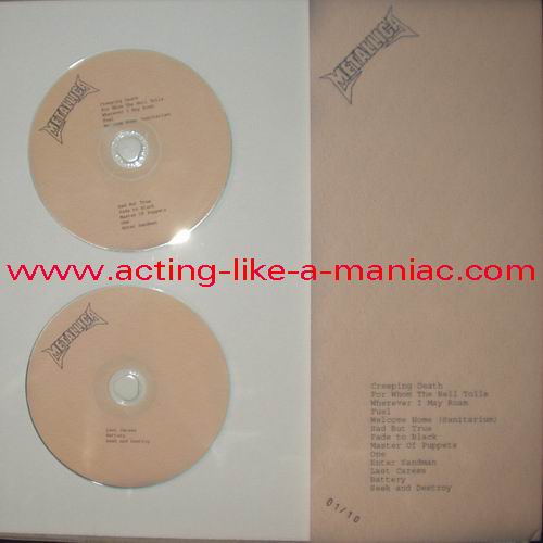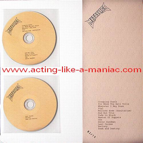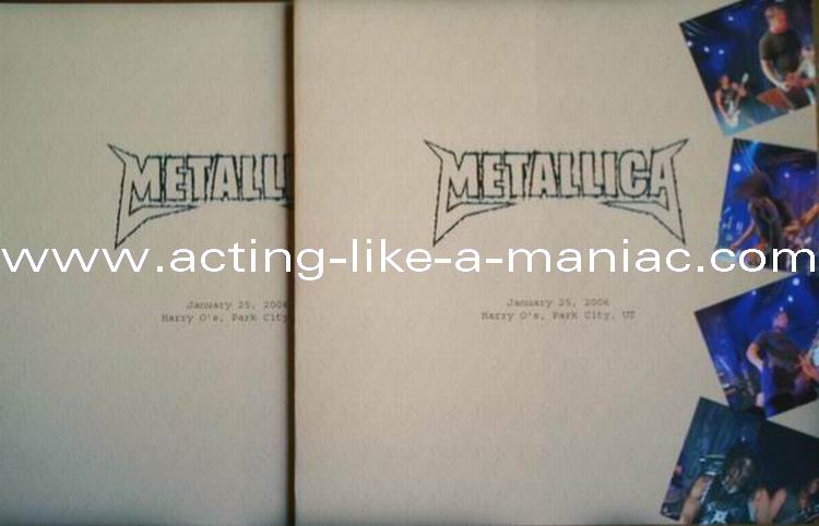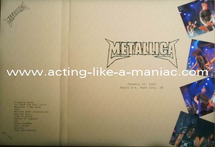 Type Of Vinyl: 3LP + 2CD-R Country / Year: Original/1st Pressing; France/June 2006 Reissue/2nd Pressing; France/late 2009 Company: None Source / Date: Harry O's, Park City, USA 25/01/06 Matrix: No Matrix At All (acetate bootleg) Track List: A. Creeping Death, For Whom The Bell Tolls B. Wherever I May Roam, Fuel C. Welcome Home (Sanitarium), Sad But True D. Fade To Black, Master Of Puppets E. One, Enter Sandman F. Last Caress, Battery, Seek And Destroy