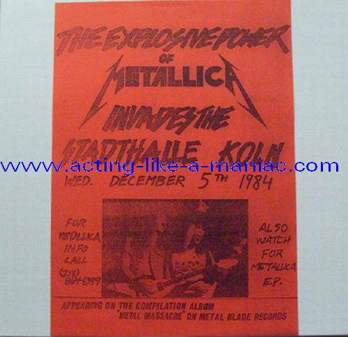 scans from "Patrick's" collection Type Of Vinyl: 1LP Country / Year: Sweden & Norway/? Company: None Source / Date: Stadthalle, Cologne, Germany, 05/12/84 Matrix: SIAH-001 A & SIAH-001 B Track List: A. Intro, Fight Fire With Fire, Ride The Lightning, Phantom Lord, The Four Horsemen B. Bass Solo, For Whom The Bell Tolls, No Remorse, Whiplash, Motorbreath