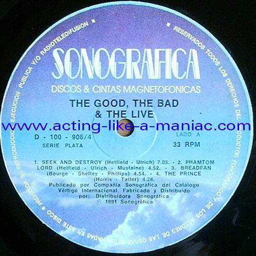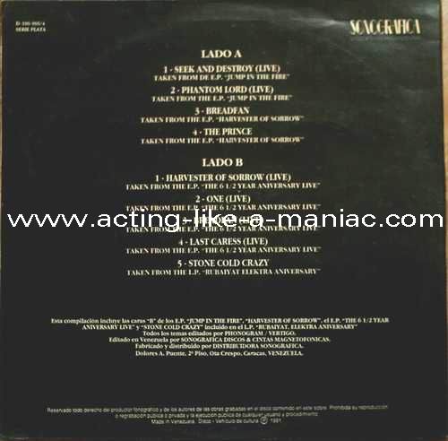 "brown/blue" labels & "purple/blue" labels Type Of Vinyl: LP Country / Year: Venezuela/1991 Company: Sonografica Source / Date: Taken From The Same Entitled Box Set Matrix: D-100906/4 -A & D-100906/4 -B Track list: A. Seek And Destroy, Phantom Lord, Breadfan, The Prince B. Harvester Of Sorrow, One, Breadfan, Last Caress, Stone Cold Crazy