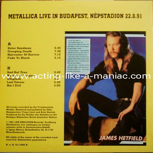 Type Of Vinyl: LP Country / Year: Germany/1991 Company: Les Preludes Records Source / Date: Nepstadion, Budapest, Hungary, 22/08/91 Matrix: 16202 A G.P. & 16202 B G.P. Track List: A. Enter Sandman, Creeping Death, Harvester Of Sorrow, Fade to Black B. Sad But True, Master Of puppets, Whiplash, Last Caress, Am I Evil ?