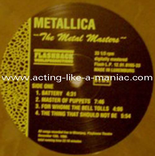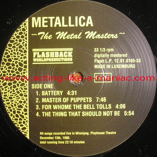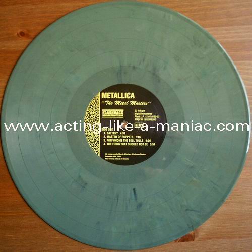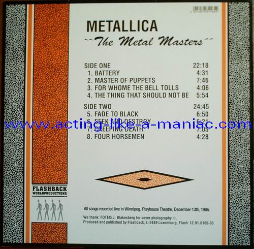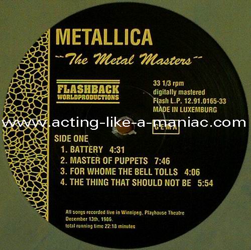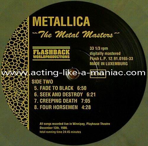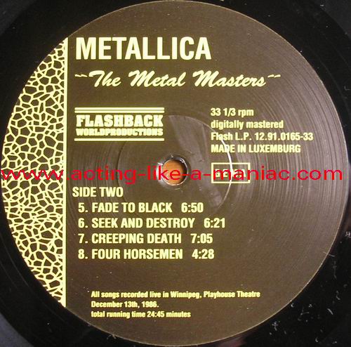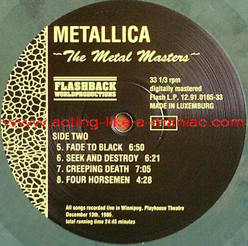 brown marbled vinyl, scan from the collection of Daniele, many thanks Type Of Vinyl: LP Country / Year: Luxembourg/1991 Company: Flashback Worldproduction Source / Date: Playhouse Theatre, Winnipeg, Canada, 13/12/86 Matrix: FB - 12.91.0165-33 A G.P. & FB - 12.91.0165-33 B G.P. Track List: A. Battery, Master Of Puppets, For Whom The Bell Tolls, Welcome Home (Sanitarium) B. Fade To Black, Seek And Destroy, Creeping Death, The Four Horsemen