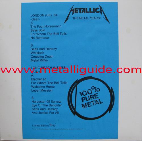 unnumbered version (my copy) Type Of Vinyl: 2LP Country / Year: Germany/199? Company: None Source / Date: *Lyceum, London, England, 20/12/84 **Long Beach Arena, Long Beach, USA, 07/12/88 Matrix: 11009004 A SNB & 11009004 B SNB (Teutonicus Furor) 11009007 A & 11009007 B (Caught In The Act) Track List: A. The Four Horsemen, Bass Solo, For Whom The Bell Tolls, No Remorse B. Seek And Destroy, Whiplash, Creeping Death, Guitar Solo, Metal Militia C. Blackened, For Whom The Bell Tolls, Welcome Home, Leper Messiah D. Harvester Of Sorrow, Eye Of The Beholder, Seek And Destroy, And Justice For All