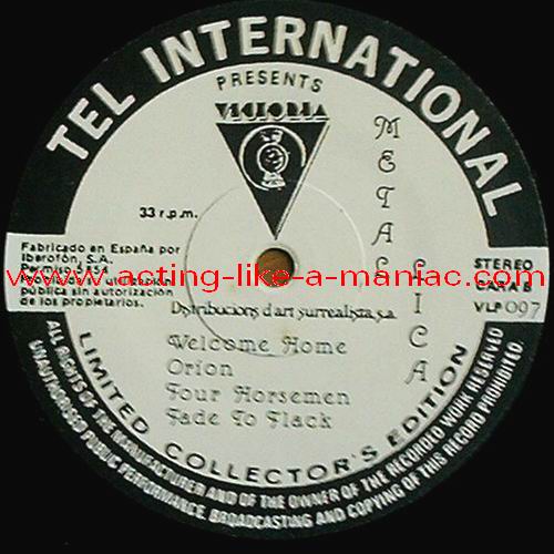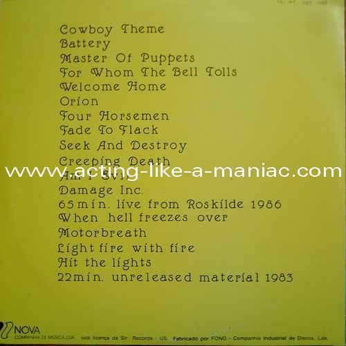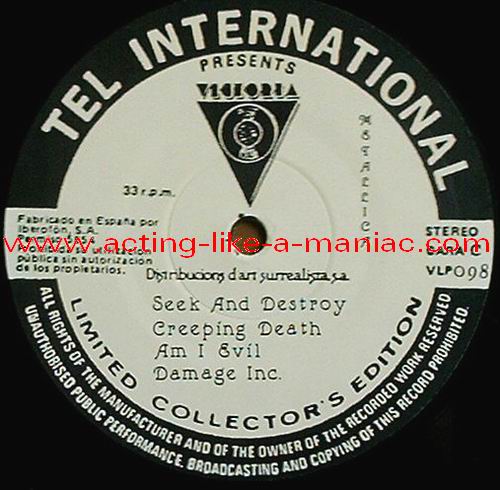 LABEL DETAILS; record two (side three) is misspressed Type Of Vinyl: 2LP Country / Year: Spain/1987 Company: Nova/Tel International Source / Date: *Dyrskuepladsen, Roskilde, Denmark, 06/07/86 **"No life 'til leather" Demos 07/82 ***"Ride The Lightning" Demos 09/83 Matrix: METAL I A & METAL I B & METAL II C & METAL II D Track List: A. Intro*, Battery*, Master Of Puppets*, For Whom The Bell Tolls* B. Welcome Home (Sanitarium)*, Bass Solo*, The Four Horsemen*, Fade To Black* C. Seek And Destroy*, Creeping Death*, Am I Evil ?*, Damage Inc.* D. The Call Of Ktulu***, Motorbreath**, Fight Fire With Fire***, Hit The Lights***