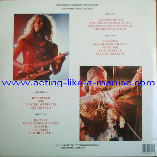 Type Of Vinyl: 2LP Country / Year: England/1990 Company: Satellite Communications Recording Company Source / Date: Wembley Arena, London, England, 23/05/90 Matrix: XLPZ 05 A 1 2 & XLPZ 05 B 1 1 & XLPZ 05 C 1 3 & XLPZ 05 D 1 1 XLPZ 05 A 1 3 & XLPZ 05 B 1 4 & XLPZ 05 C 1 3 & XLPZ 05 D 1 1 XLPZ 05 A 1 3 & XLPZ 05 B 1 4 & XLPZ 05 C 1 3 & XLPZ 05 D 1 1 S1 1 Track List: A. Intro, Creeping Death, For Whom The Bell Tolls, Welcome Home (Sanitarium), The Shortest Straw B. Bass Solo, Whiplash, Fade To Black, Seek And Destroy C. Blackened, One, Master Of Puppets, Guitar Solo D. Battery, The Frayed Ends Of Sanity, Last Caress, Am I Evil ?, Helpless, Motorbreath