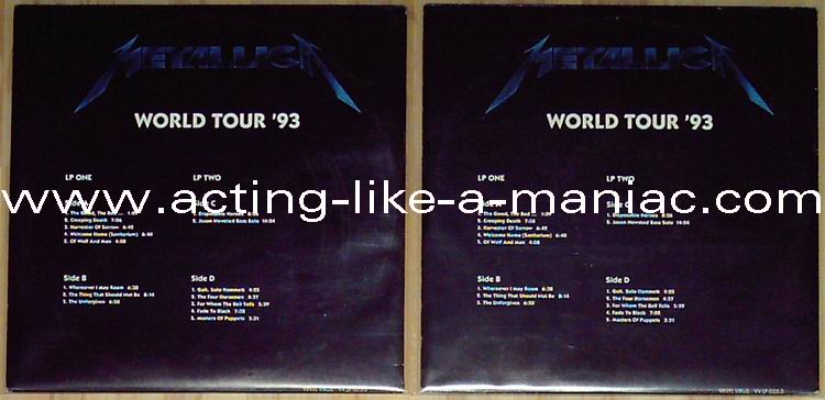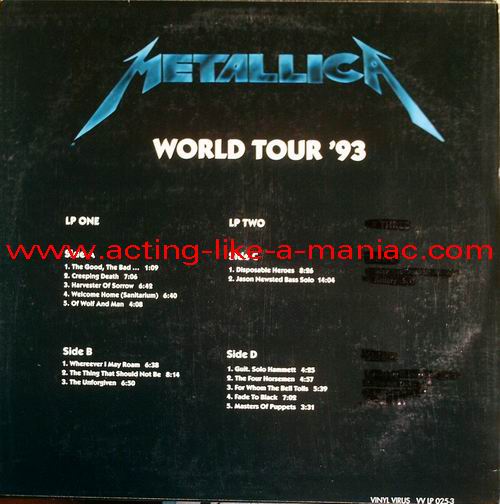 LABEL DETAILS; Type Of Vinyl: 2LP Country / Year: Europe/1994? Company: Vinyl Virus Source / Date: The National Bowl, Milton Keynes, England, 05/06/93 Matrix: VV 025 -A- & VV 025 -B- & VV 025 -C- & VV 025 -D- Track List: A. Intro, Creeping Death, Harvester Of Sorrow, Welcome Home (Sanitarium), Of Wolf And Man B. Wherever I May Roam, The Thing That Should Not Be, The Unforgiven C. Disposable Heroes, Bass Solo D. Guitar Solo, The Four Horsemen, For Whom The Bell Tolls, Fade To Black, Master Of Puppets