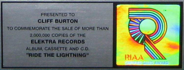"Ride The Lightning" 2x Multi-Platinum Sales Award, presented to Cliff Burton!!!